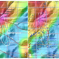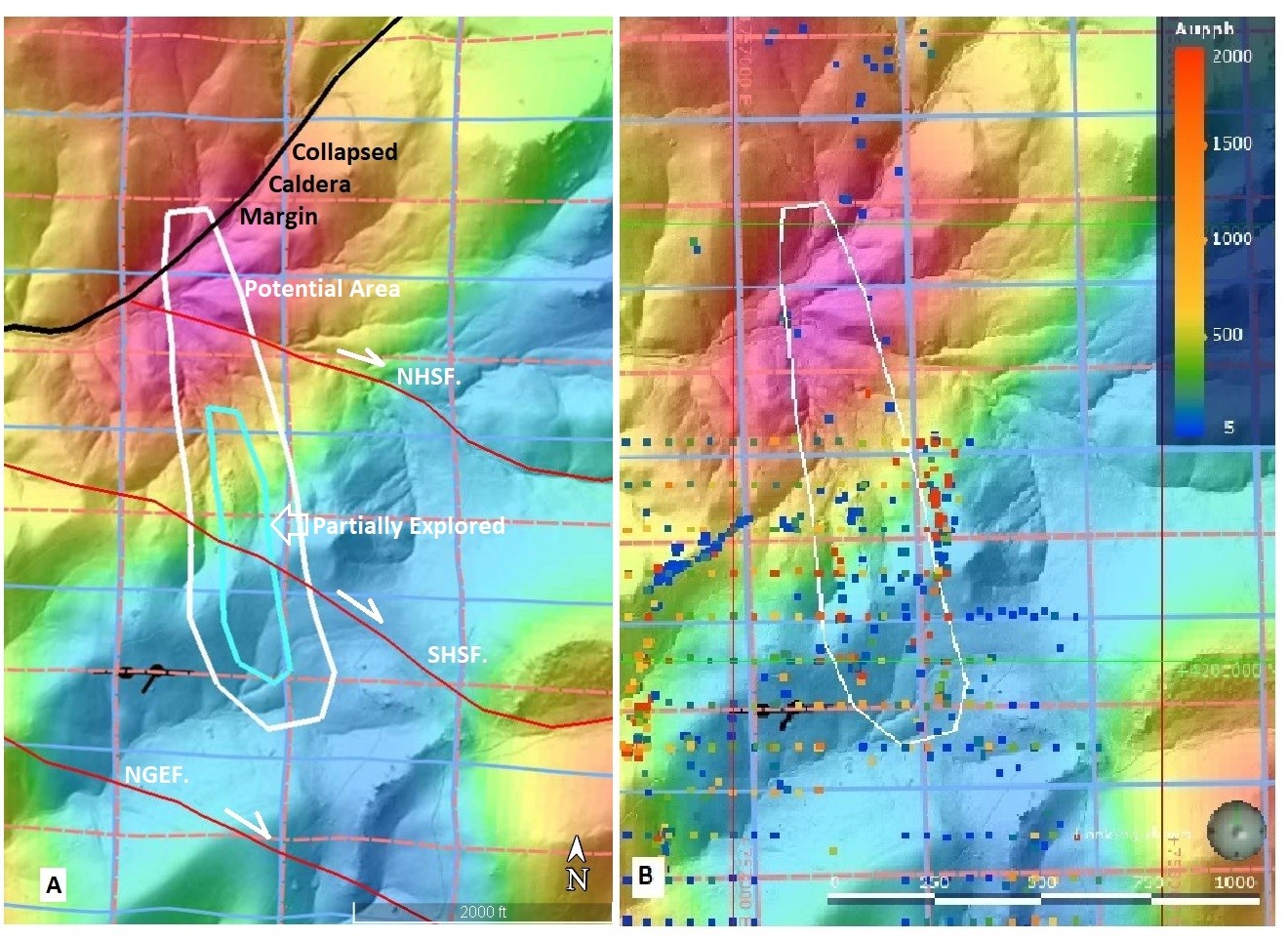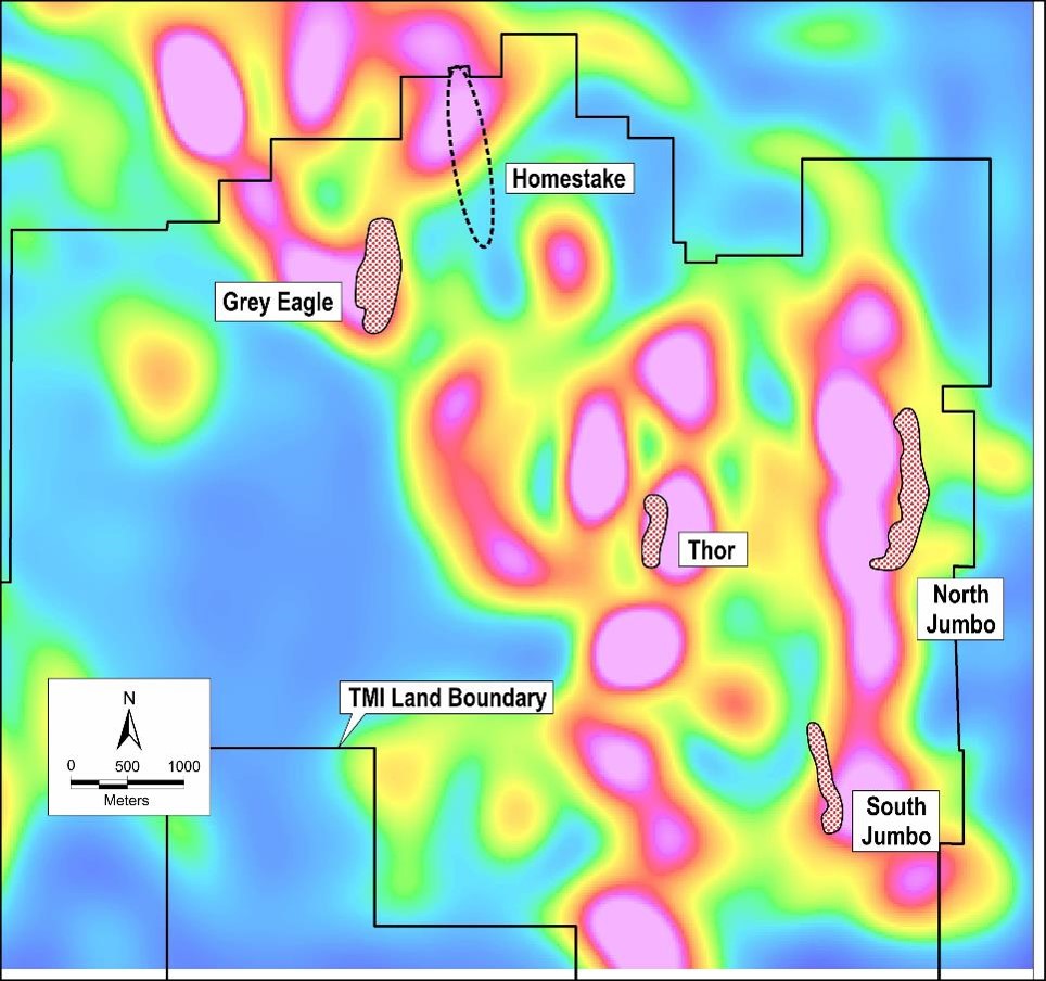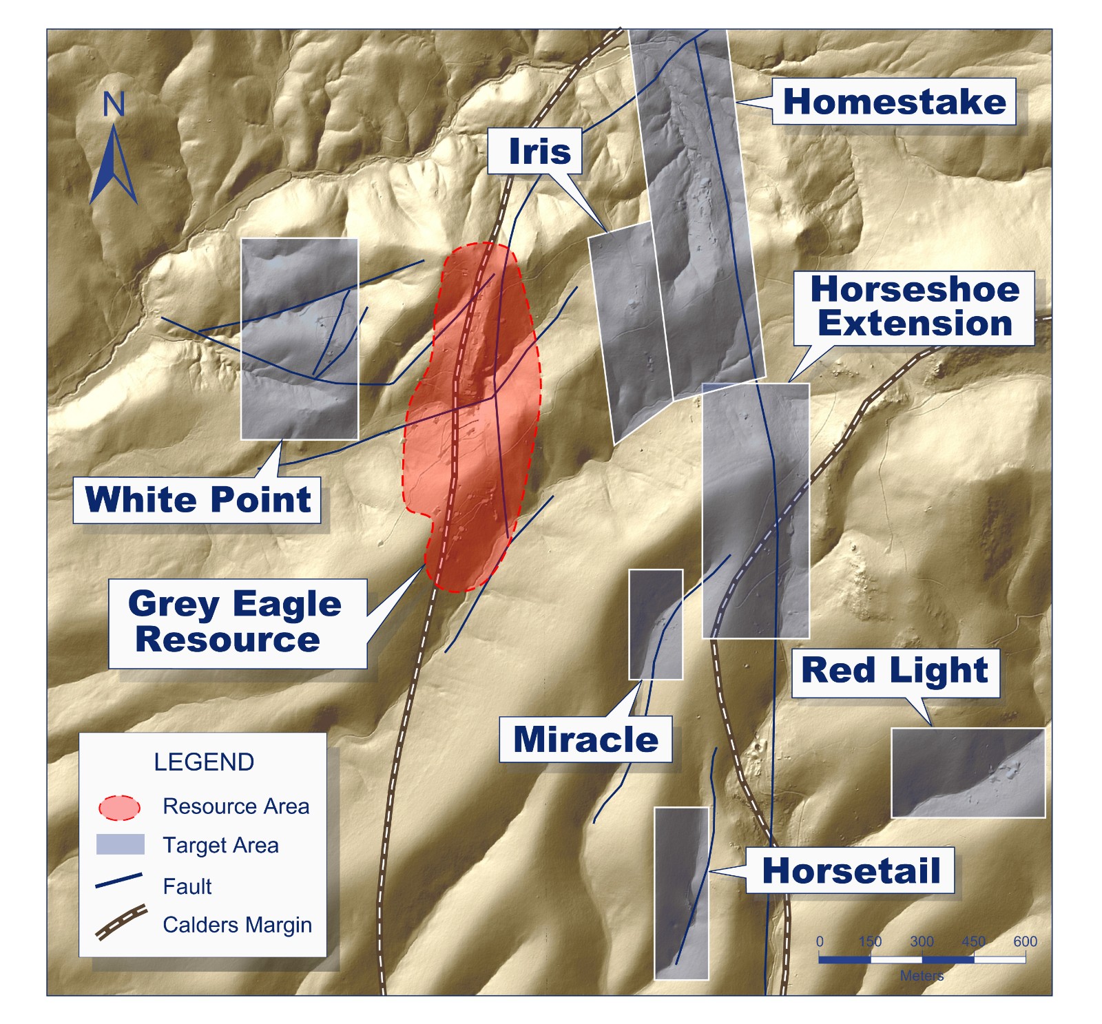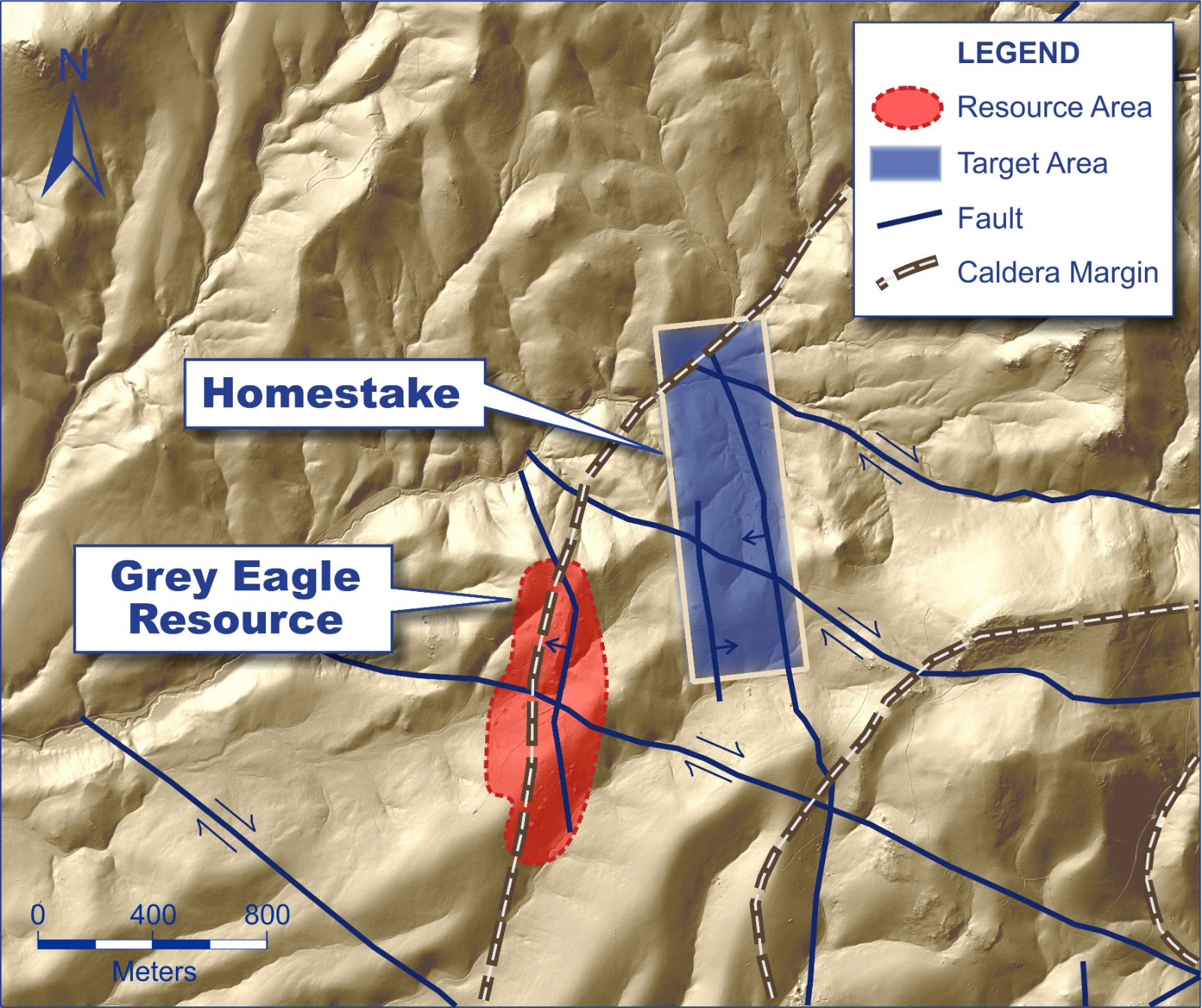 The Homestake target is located between the North Grey Eagle right lateral strike-slip fault and the margin of a collapsed caldera (see map below). Two right lateral strike-slip faults pass through the Homestake target. Movement along the faults created a northwest elongation for this target. The area north of the current drilling, in the margin of the collapsed caldera coincides with a ZTEM resistivity high.