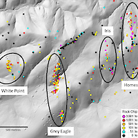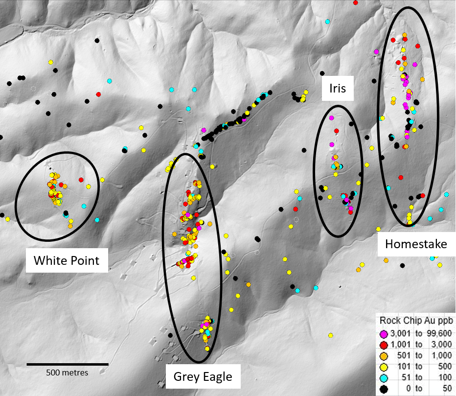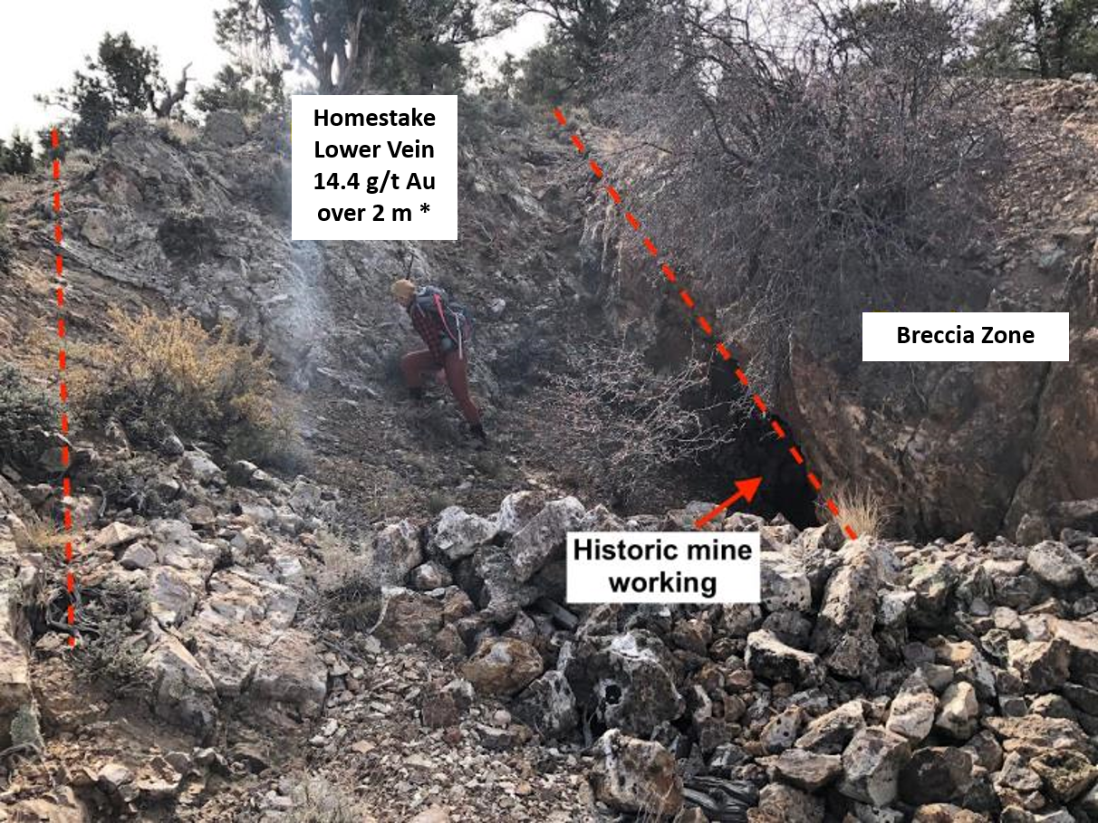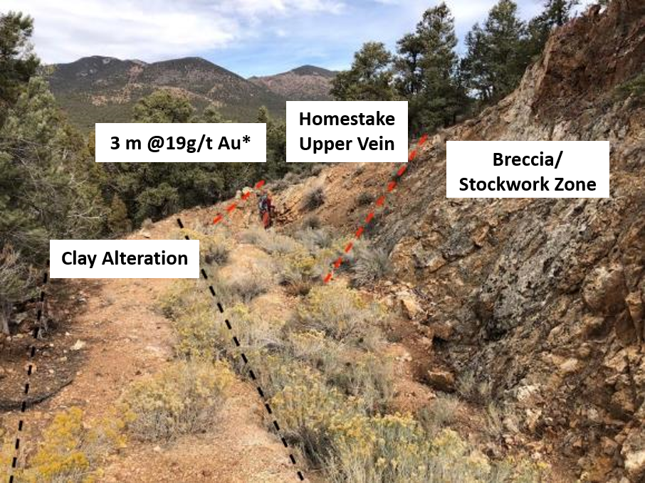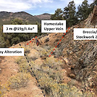 The west-dipping Homestake veins are 2-4 meters wide and return continuous surface samples of 3-15 g/t Au for a strike length of 600 meters with many values of +10 g/t Au   Silver values are generally +25 g/t with a high of 68 g/t. The host rocks to the veins have been hydrothermally brecciated, quartz-sericited altered, and contain stockwork quartz veining.  This altered and stockwork veined wallrock extends for up to 400 meters east-west, surrounding the veins, before disappearing under post-mineral cover. Sampling of the breccia zones returns gold values up to 1.6 g/t and silver values up to 68.1 g/t and from the stockwork zones gold values of up to 2.4 g/t with silver up to 9.9 g/t were produced. The Iris vein is located 230 meters west of, and dips back toward, the Homestake veins and is thought to be part of the same system connecting at depth. Sampling of the Iris vein returned the highest-grade rock sample with up to 30 g/t Au.  Trenching from 2016 along the Iris vein continually returned values of 2-17 g/t Au along the 20-meter strike length of the vein exposed in trenches. High-grade stream sediment samples occur in bounding drainages. Both the Homestake and Iris veins show up as north-south trending soil anomalies with many +0.10 g/t Au values. This high-grade zone is contained within a larger halo of lower-grade gold anomalies.
