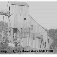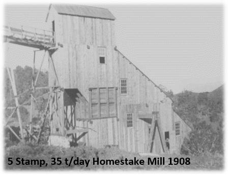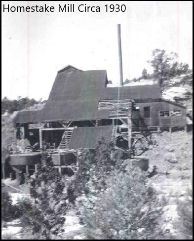 The Homestake claims which include the historical Underground Homestake Mine were originally identified in 1897 and underground mining began in 1904. One of the only three mills within the area was located at the mine site (see pictures below). Mining at the historical Homestake Mine continued sporadically until the start of World War II when operations ceased and never started up again.