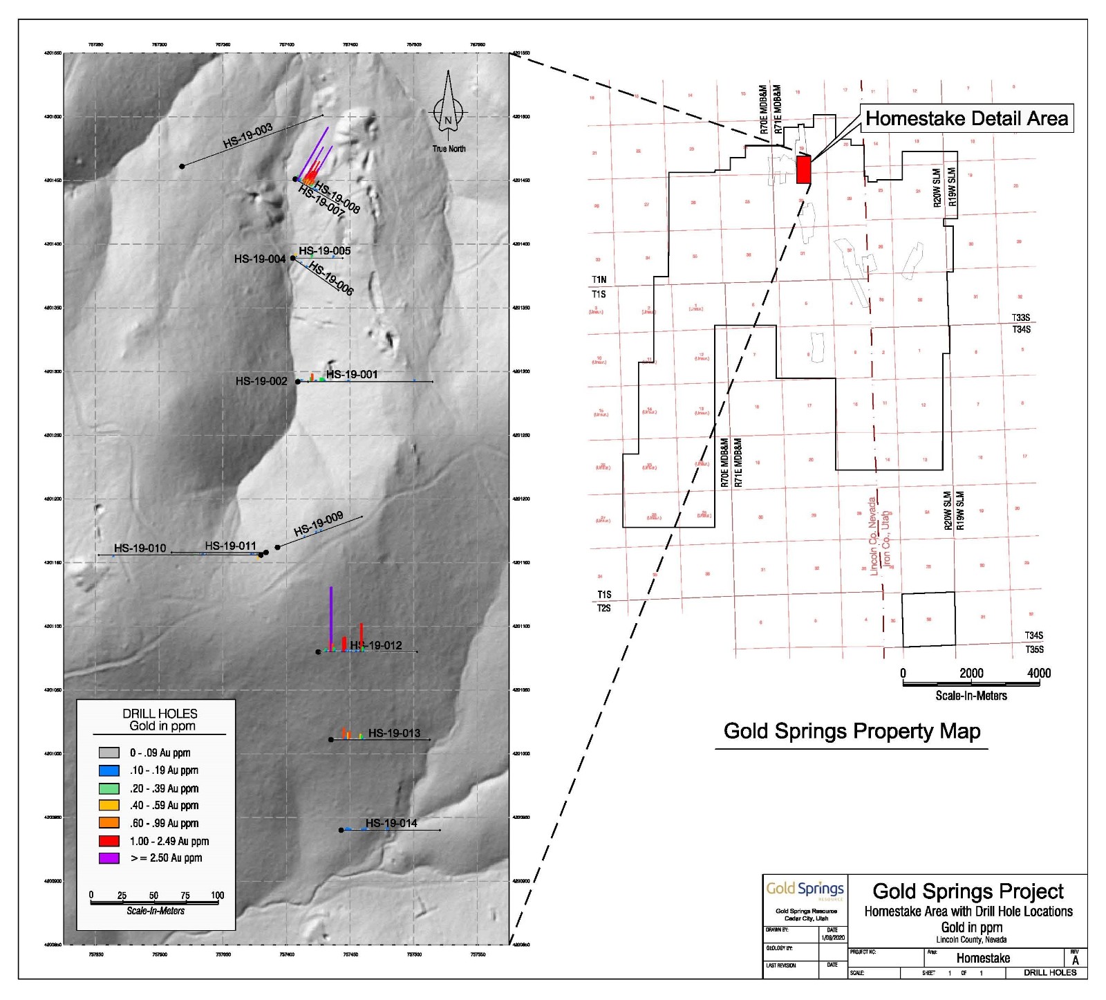In 2019 a drill program of 1,856 meters in 14 holes targeted the Homestake veins covering 600 meters of strike length. Drilling interested bonanza grade mineralization near surface at the northern exposure of the vein with a 6.1-meter interval grading 21.9 g/t Au and 69.3 g/t Ag and a second larger 71.6-meter-wide zone grading 0.7 g/t Au and 1.9 g/t Ag in hole HS-19-007. Drilling has shown the two veins seen at surface at Homestake are a splay set of the main vein and converge about 20 meters below the surface. Four hundred meters to the south, the vein splays into a set of three parallel veins averaging one-meter widths at surface returning grades of 1.12-4.23 g/t Au and 2.5-8.5 g/t Ag from intercepts in hole HS-19-012. Other holes along strike returned little to no gold but contained anomalous silver. Drill results suggest gold mineralization is not as continuous as surface sampling shows, but rather distributed in high grade ore shoots within the vein system and requires tighter spaced drilling.  The Company plans to conduct additional drilling at Homestake offsetting the high-grade discovery hole as well as extending the drilling along strike to the north and south.    You can view all drill results of the 2019 program here.