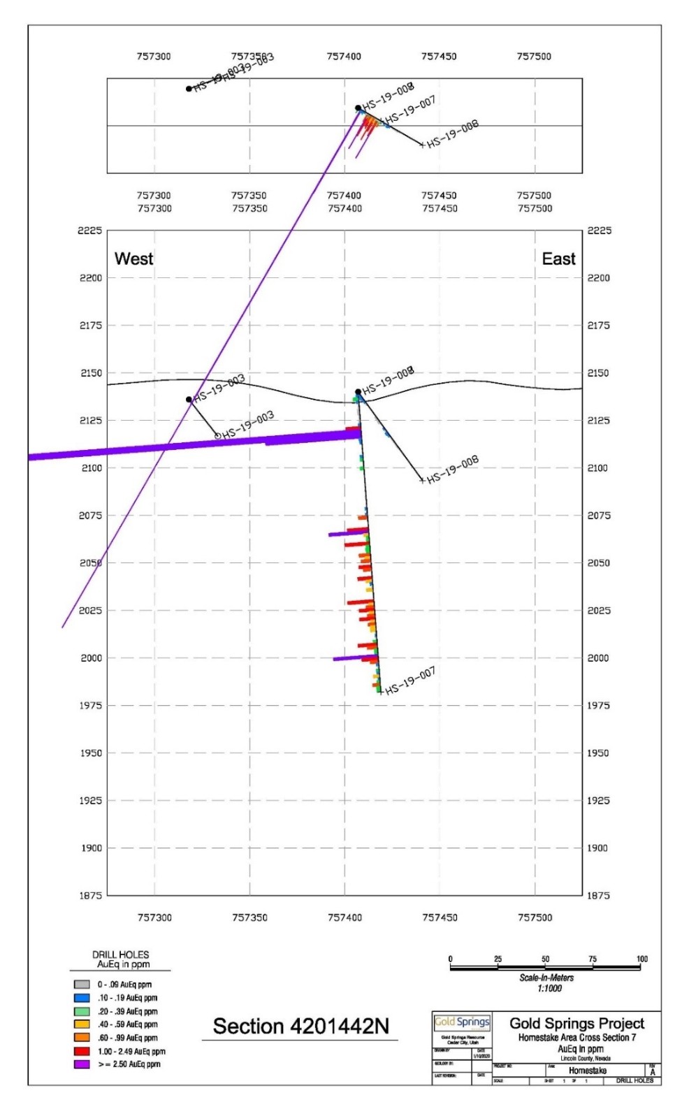 • 22.86 g/t gold equivalent over   6.1 meters and a wide zone with   0.74 g/t gold equivalent over 71.6 meters in hole HS-19-007.