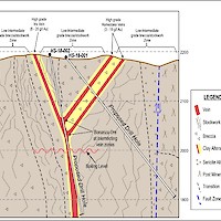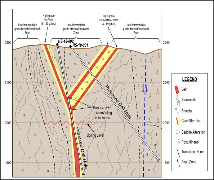 The Homestake target is a part of the overall Homestake-Iris vein system and is characterized by a set of north-south trending banded quartz and quartz calcite veins with opposing dips. The Homestake veins are two parallel, stacked veins of colloform banded and bladed quartz that dip shallowly (45-55 degrees) to the west, while the Iris vein is a quartz-calcite banded vein dipping steeply (75-85 degrees) to the east. These veins represent a classic epithermal vein system with potential for bonanza grade mineralization at the intersection of the vein sets (see a representative conceptual cross section in pictures below).  Vein widths vary but are generally 2-4 metres before being obscured by post mineral cover to the north and south. Veins are margined by wide zones of silicified breccias, quartz-sericite alteration, and stockwork quartz veining within the porphyritic andesite host rock. Breccia and stockwork zones together extend for a 400 meters width before being lost under post mineral cover.