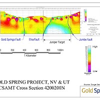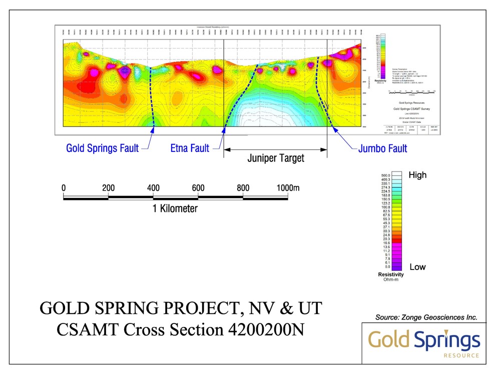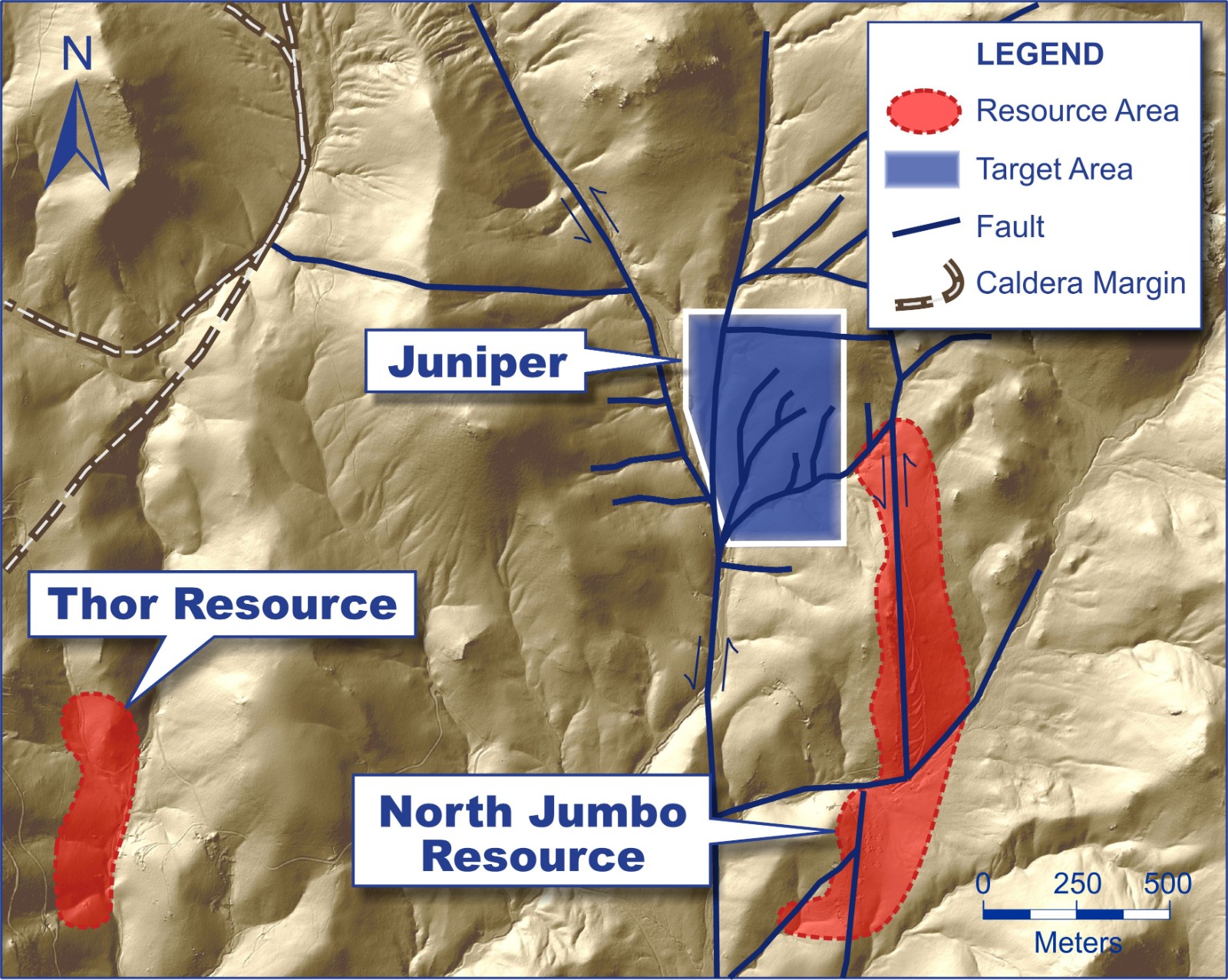 The Juniper target lies on the Utah side of the Gold Springs project and is situated 200 meters northwest of, and runs parallel to, the North Jumbo resource.