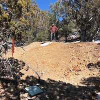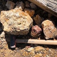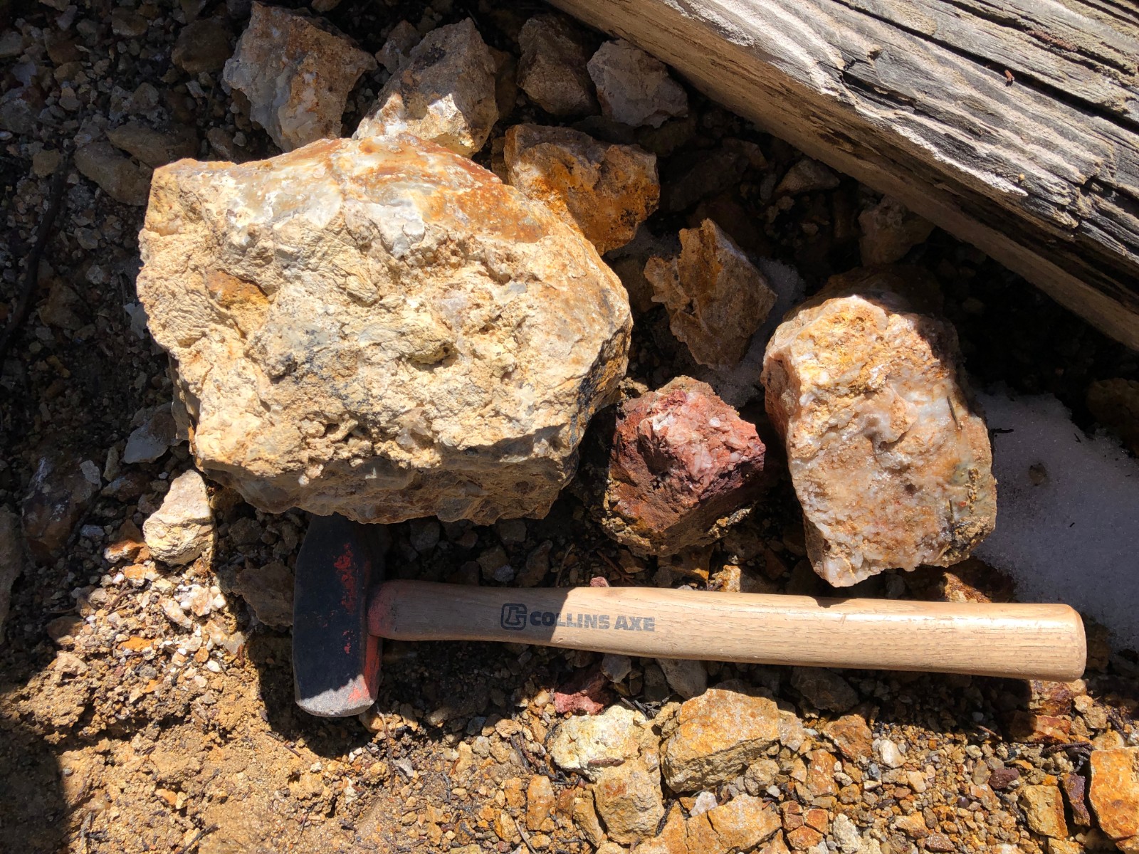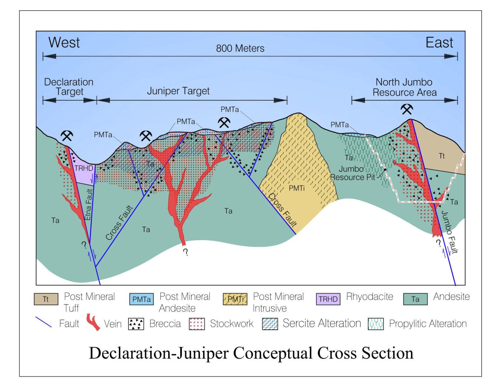 The northern portion of the Juniper target is predominantly covered by post-mineral volcanic flows. Windows exposing the underlying material contain strongly quartz-sericite altered andesite frequently containing veins up to 0.5 meters in width and broad zones of stockwork veins and breccia development. The style of mineralization, the alteration and the structural setting at Juniper are like those seen in the southern portion of the North Jumbo resource where +100 meter zones of +1 g/t Au have been intersected in drilling. Historical mine pits are seen throughout the juniper target area, exposing quartz veins, hydrothermal breccias, and strongly altered andesite. Juniper has scattered exposures of altered and veined outcrop showings, that can be seen through windows in the overlying post-mineral material. It appears that the quartz-sericite alteration and stockwork veining extends under the thin cover, potentially stretching over an area roughly 600 x 400 meters and remains open to the north where the possible extension goes under post-mineral cover.