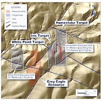 The Iris target is located 230 metres west of the Homestake target and 450 metres east of the Grey Eagle resource within the Nevada portion of the Gold Springs property.