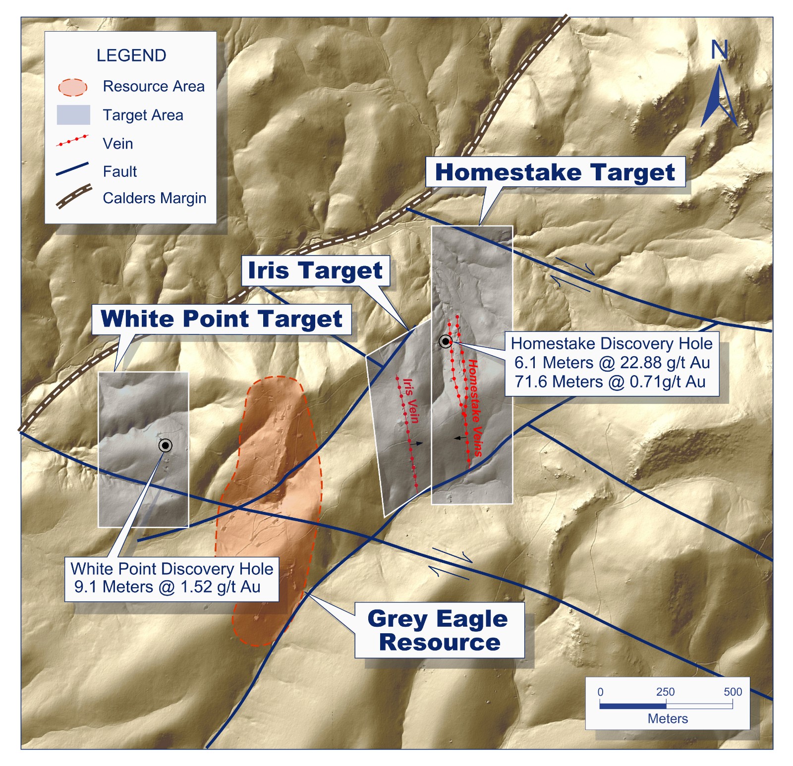 The Iris target shares structural settings with the Homestake area and is located between the North Grey Eagle and North Homestake right-lateral strike-slip faults and the margin of a large collapsed caldera. These features combine to make this area structurally complex providing several high-priority target areas.