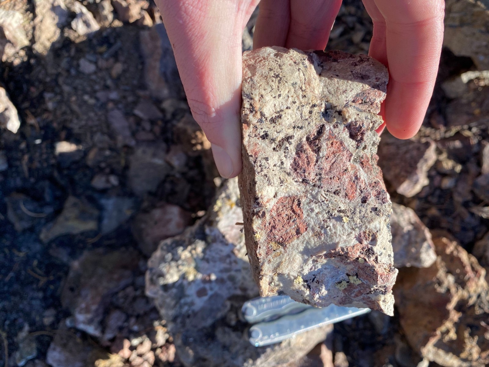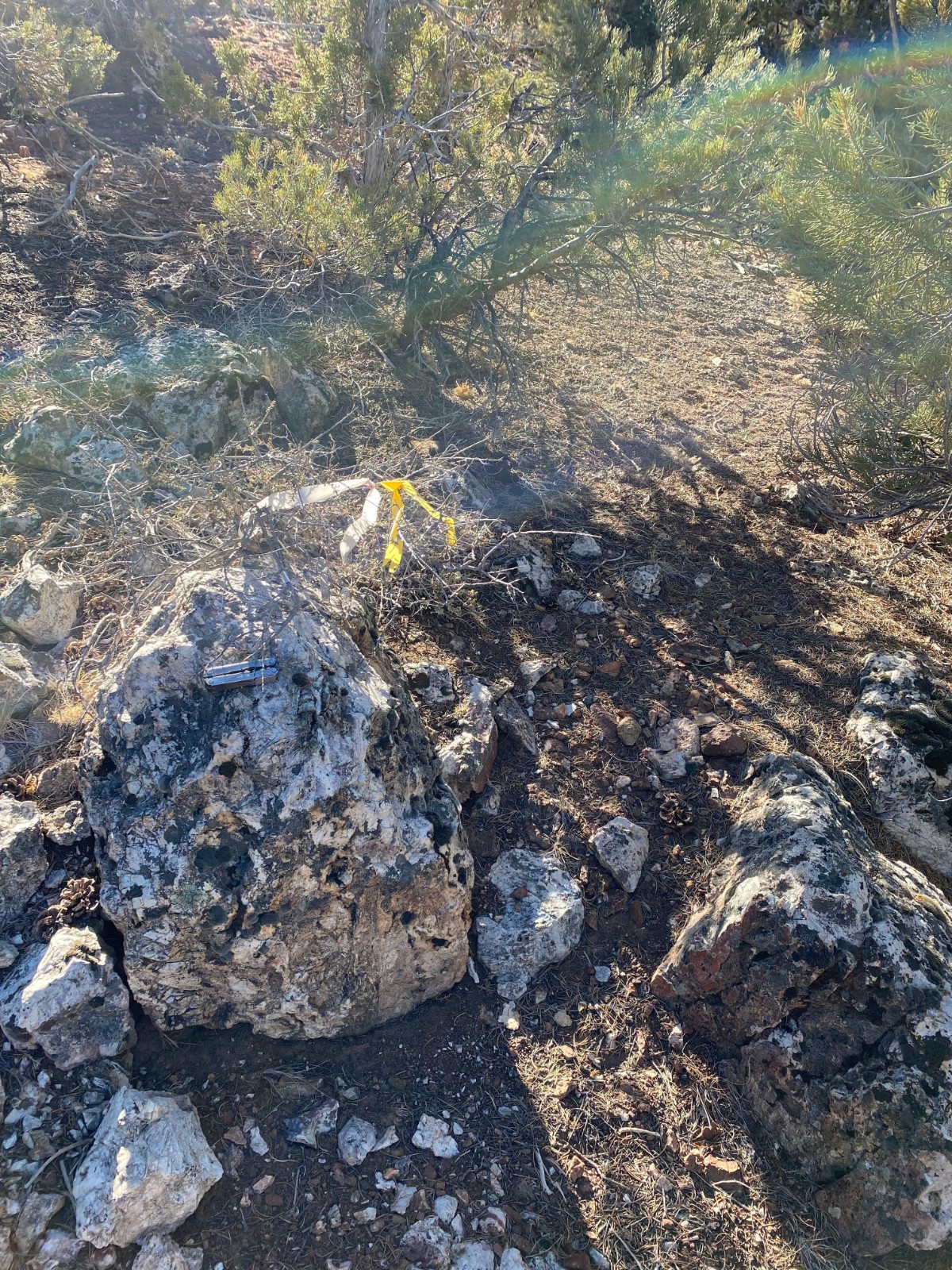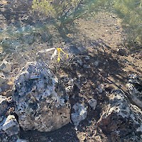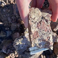 The iris vein is a calcite-dominated, banded, epithermal vein that trends north-south and is traceable at surface for a strike length of 400 metres. Together with the Homestake vein sets the system represents a classic epithermal vein target with potential for bonanza grade mineralization at the intersection of the two vein sets. The Homestake veins are two parallel veins of banded and bladed quartz that dip shallowly to the west, while the Iris vein is a calcite-quartz banded vein dipping steeply to the east. Where these veins intersect there is potential for high-grade mineralization.