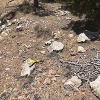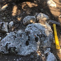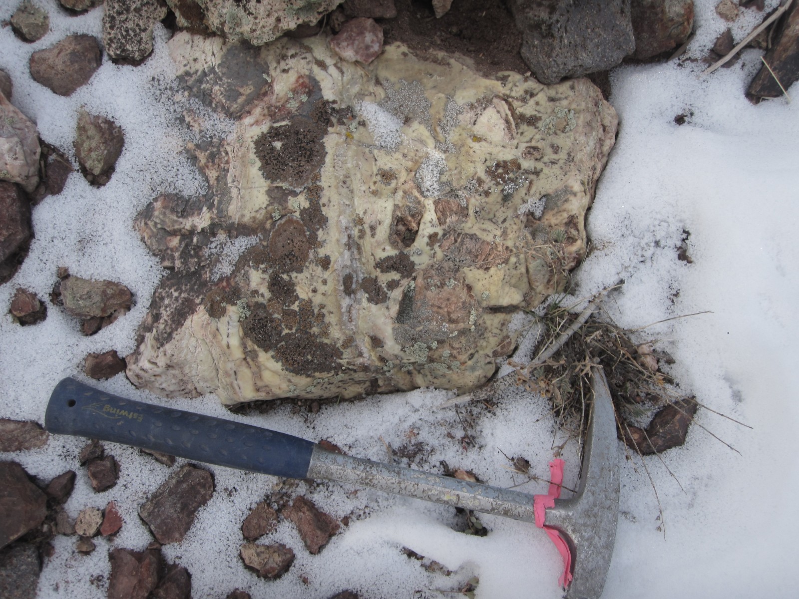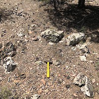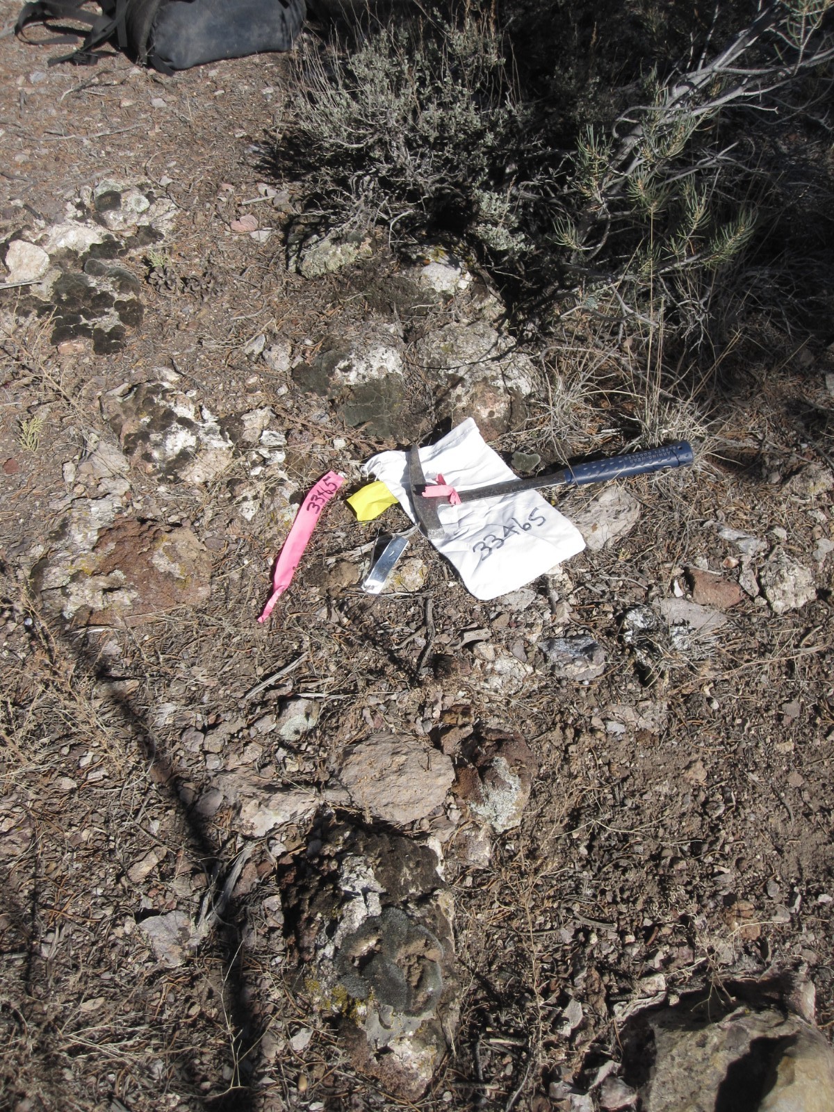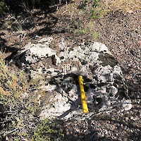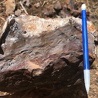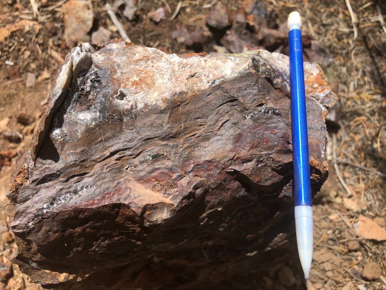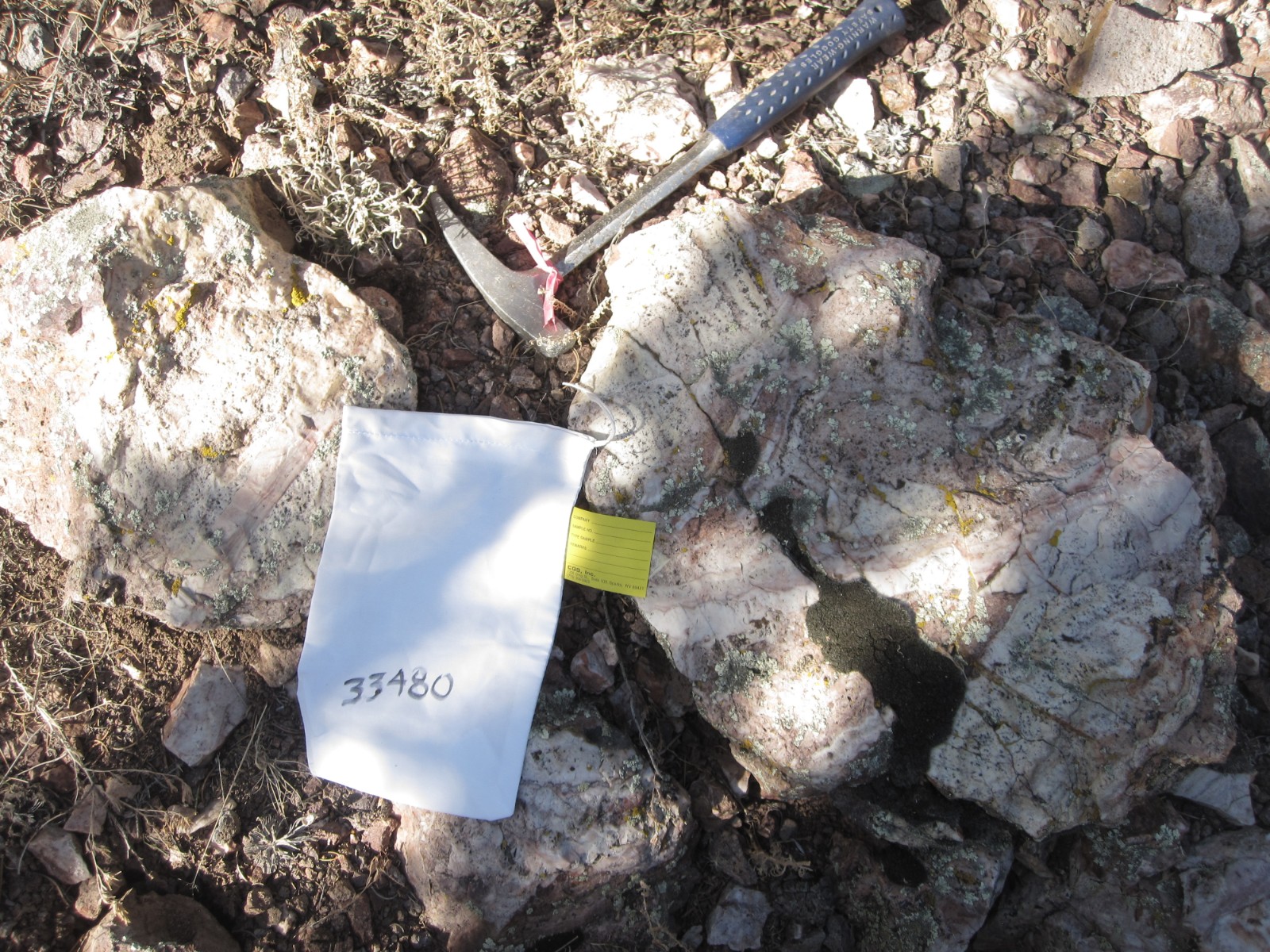 Mineralized float is found over a 1.7 x 2.0 km area which provides an indication of the large potential size of this target. Workings in the area reveal altered and mineralized andesite below post-mineral tuffs and colluvium. Outcropping and sub-outcropping calcite-quartz veins are also found in areas near the historic workings. Veins are hosted within silicified andesite with several vein samples returning multi-gram gold values, reaching 30.3 g/t Au and 94.2 g/t silver.
