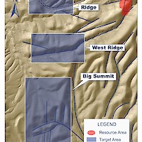 The Big Summit target is located immediately south of the Ridge and West Ridge targets and shows many similarities to those systems. Much of the area is covered with colluvium with a limited number of outcrops and historical workings offering insight into what is below.