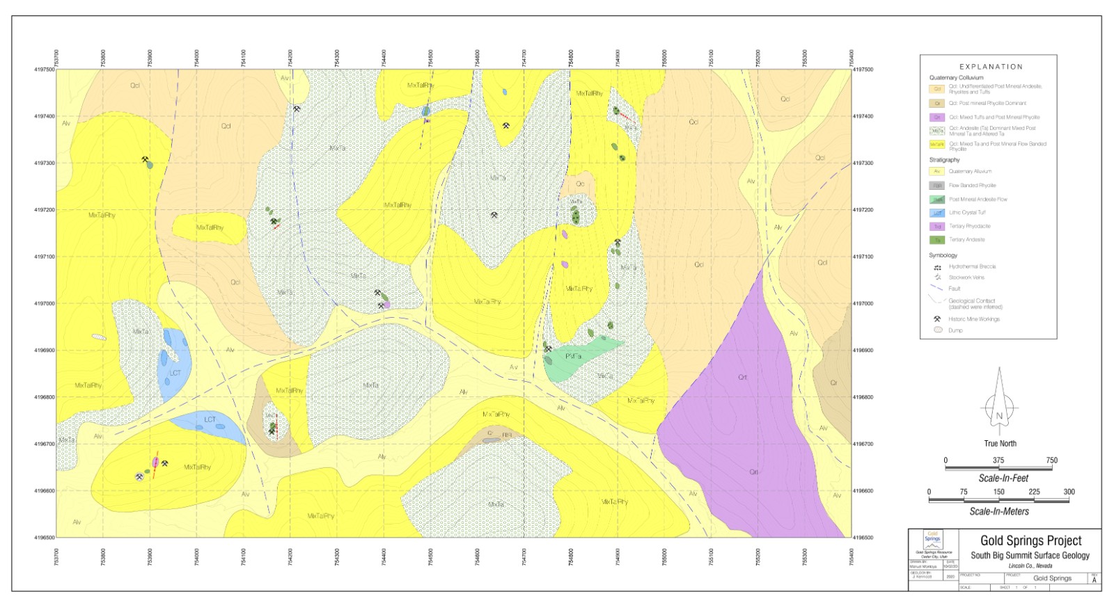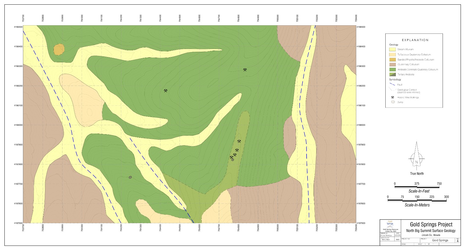 The Big Summit target is located 3 km west of the Midnight target and 1 km south of the West Ridge target in the western portion of the Gold Springs project.