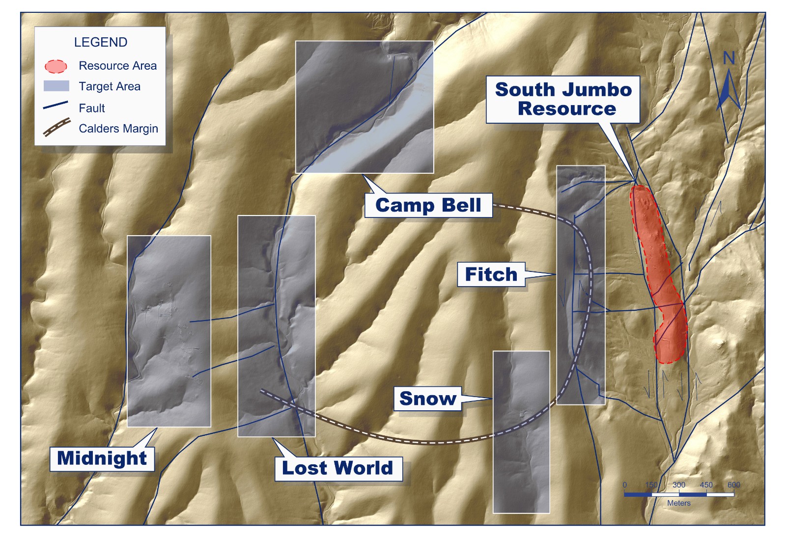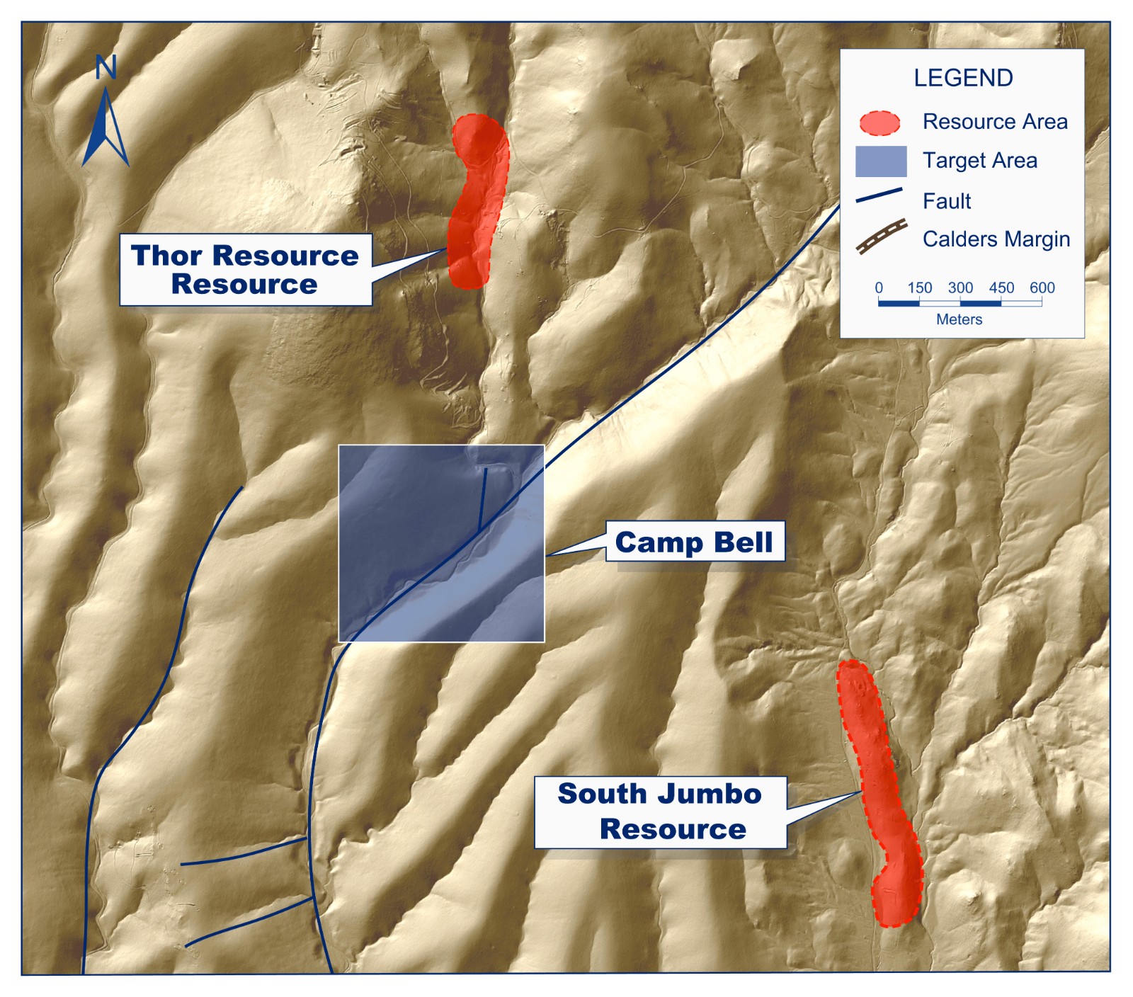 The Camp Bell target is hosted along the Gold Springs Wash structural corridor. The corridor has a strike length of over 7 kilometers and runs north-south to north-east through the Camp Bell target. At the northern end of the Camp Bell target area the Gold Springs fault system jogs to the north-east for 3 kilometres before continuing north through the Juniper target where it is known to host mineralization.