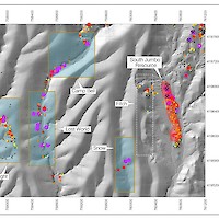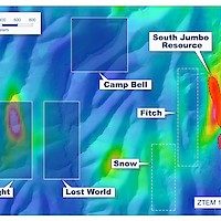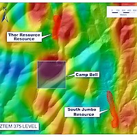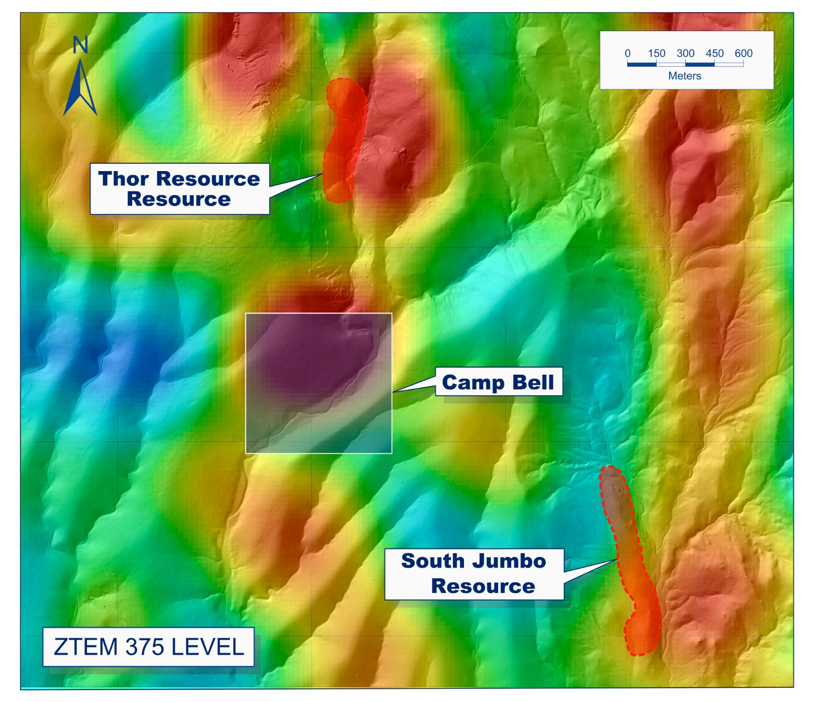 The Camp Bell target is located along a large +5-kilometre-long, north-south trending high resistivity anomaly identified with the airborne ZTEM geophysical survey, which encompassess the Camp Bell, Thor, and North Jennie target areas.