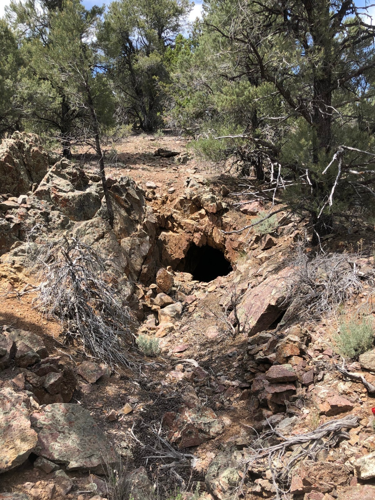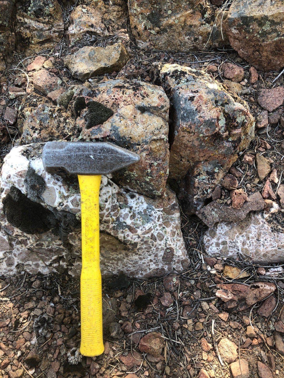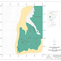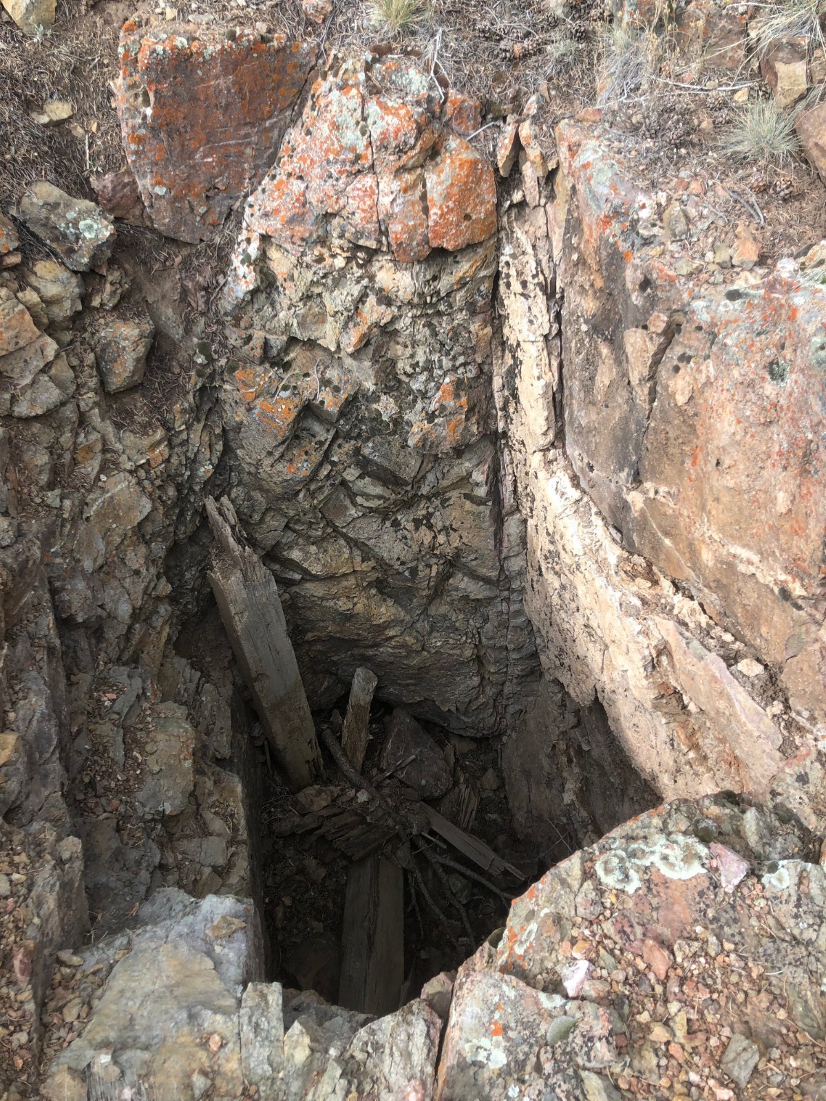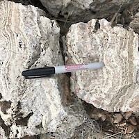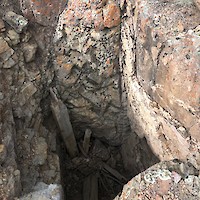 Much of the area is covered by post-mineral gravels but in the uncovered area an adit and shaft exploited a 0.5-meter-wide light-green, banded quartz-calcite vein similar to those seen at the historic Horseshoe underground mine.