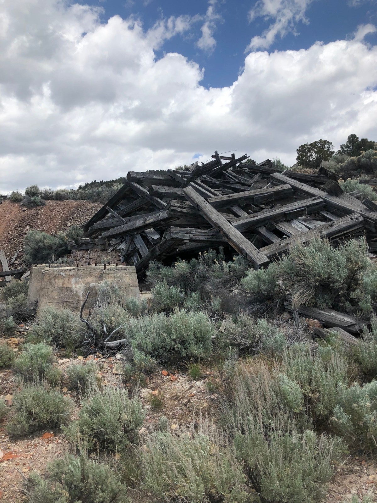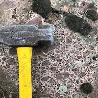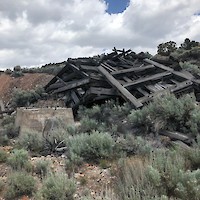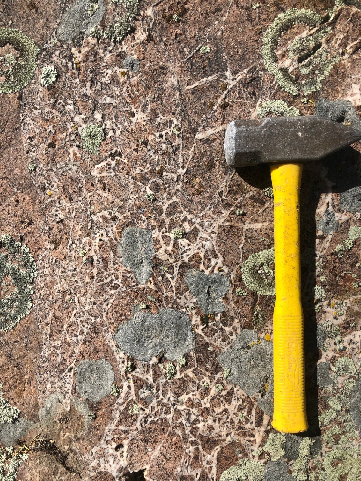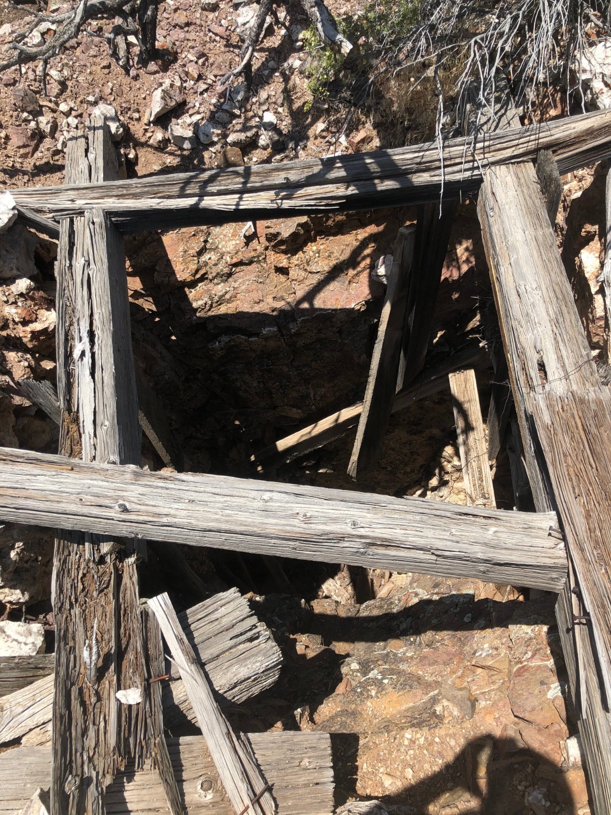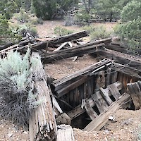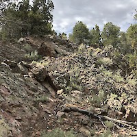 Much of the area is covered by post-mineral gravels but in the uncovered area an adit and shaft exploited a 0.5-meter-wide light-green, banded quartz-calcite vein similar to those seen at the historic Horseshoe underground mine.