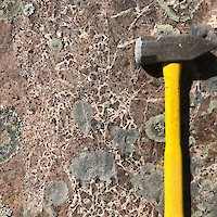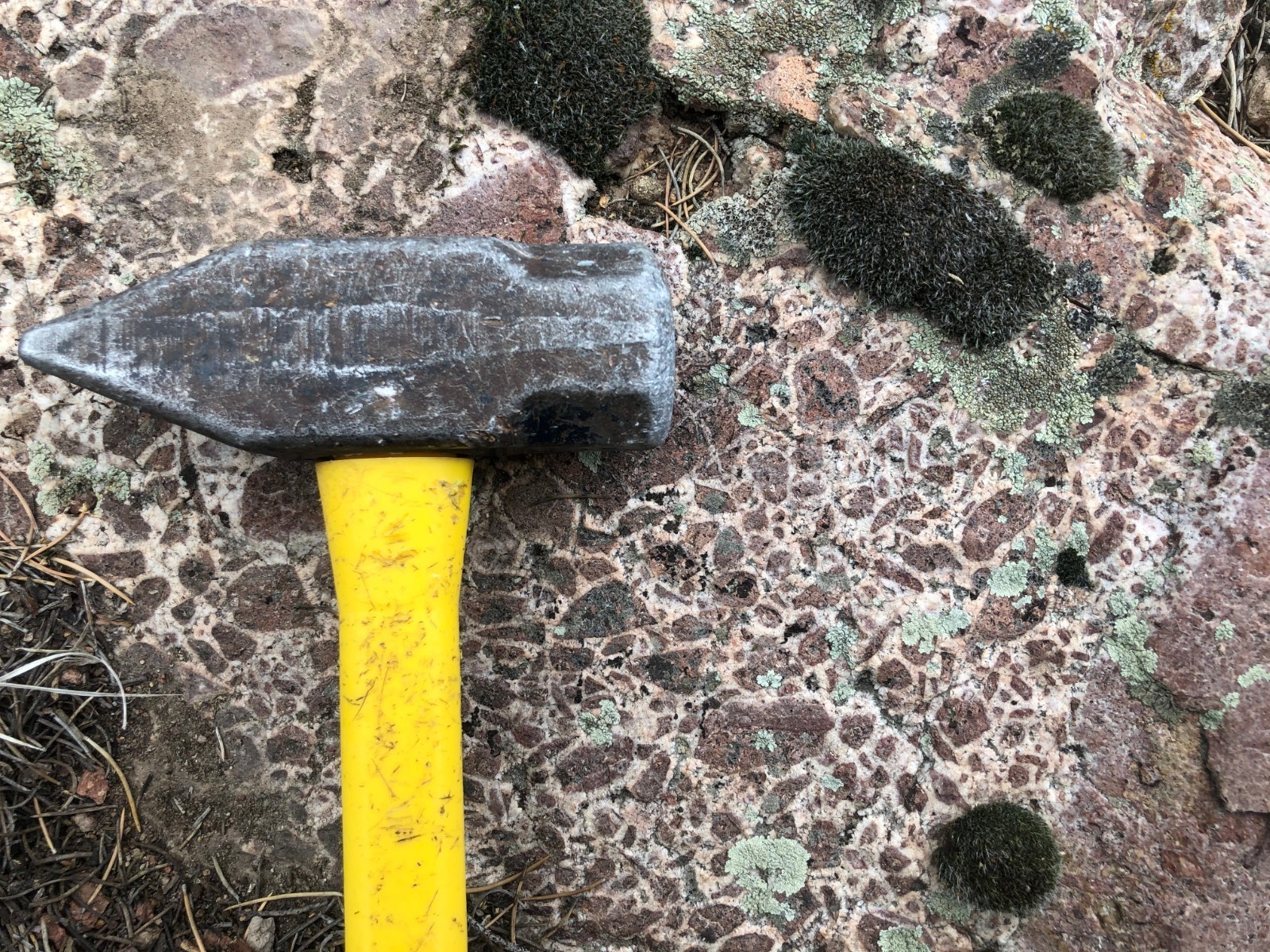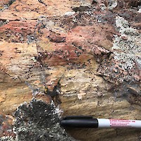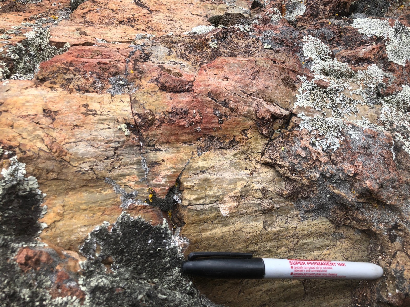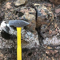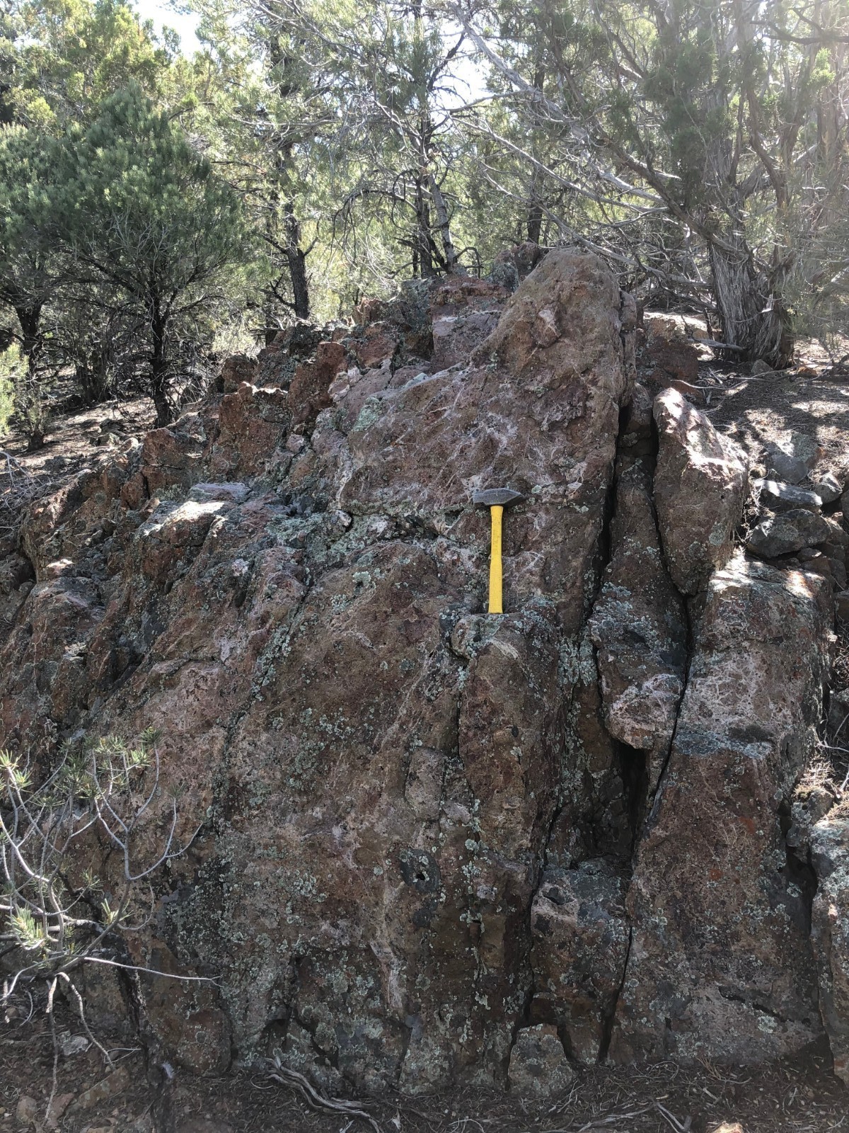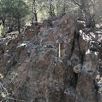 The Horsetail target consists of quartz-sericite altered andesite host rock surrounded by andesite float containing calcite-quartz vein material. A large silicified andesite ridge outcrop, approximately 30 meters by 10 meters, with zones of stockwork follows a N-S trending fault zone suggesting the potential for widespread mineralization. Much of the area is covered by post-mineral gravels but in the areas of outcrop exposure an adit and shaft exploited a 0.5-meter-wide light-green, banded quartz-calcite vein similar to those seen at the historic Horseshoe mine.