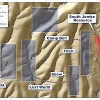 The Lost World target is located along the western edge of a large +5-kilometer-long, north-south trending high resistivity anomaly identified with the airborne ZTEM geophysical survey, which encompasses the Camp Bell, Thor, and North Jennie target areas. Immediately south of the Lost World target is a well-defined ZTEM resistivity high anomaly situated on the same trend. No target has been defined in this area due to complete cover by post-mineral colluvium (gravel). It is believed that this resistivity high could be an extension of the Lost World target (see map below).