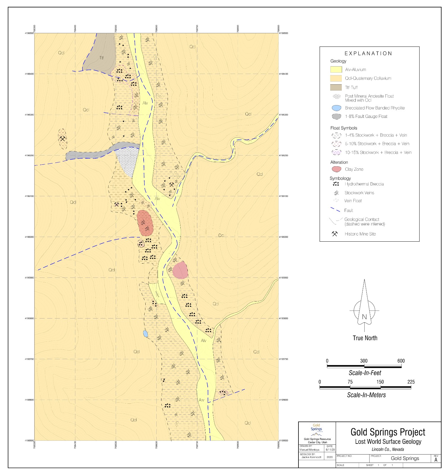 The Lost World target is dominantly covered by colluvium with a few outcrop showings. Many high-grade samples have been collected by the Company from float and rare outcroppings consisting of veins, breccia and stockwork. These gold barring samples range up to 21.38 g/t gold with 64 g/t silver. Shallow prospecting pits are found and contain mixtures of colluvium, stockwork, and breccia rubble returning gold values up to 0.95 g/t. The target is defined by the intersection of east-west faulting, which can be traced from exposures on the Midnight target, with the major north-south Gold Springs fault. This structural configuration is positive for gold deposition and is further supported by concentrations of veins and brecciated andesite float along the east-west structures. The mineralization float, the structural setting, and the target dimensions are compelling for the quality of the Lost World target.