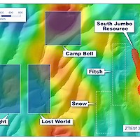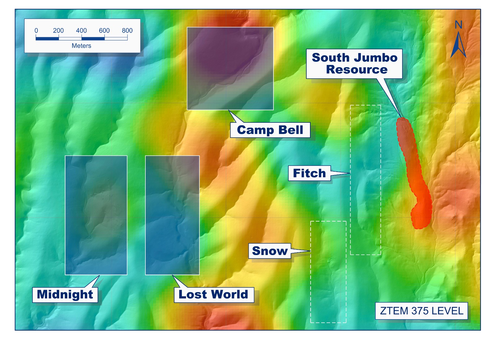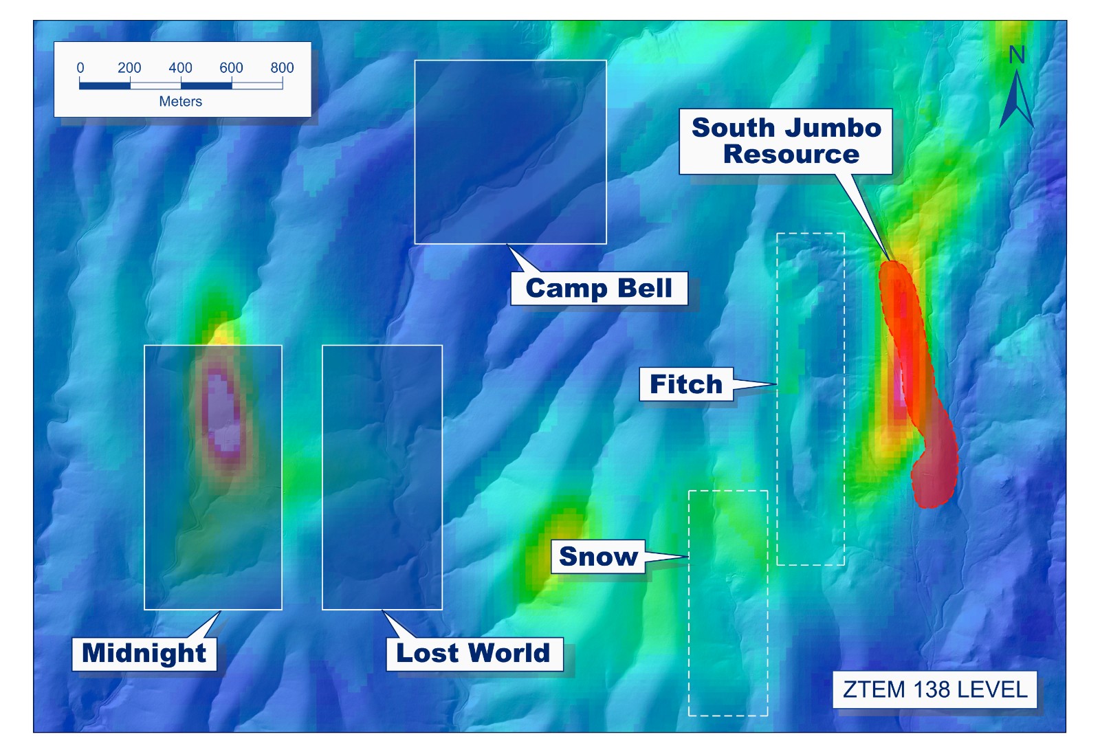 There is a strong north-south oriented resistivity high anomaly centered on the Midnight target as identified in the airborne ZTEM geophysical survey. The anomaly extends past the exposed mineralization and to the north it adjoins a strong northeast trending ZTEM resistivity anomaly along which the Thor resource and the Camp Bell target are located.