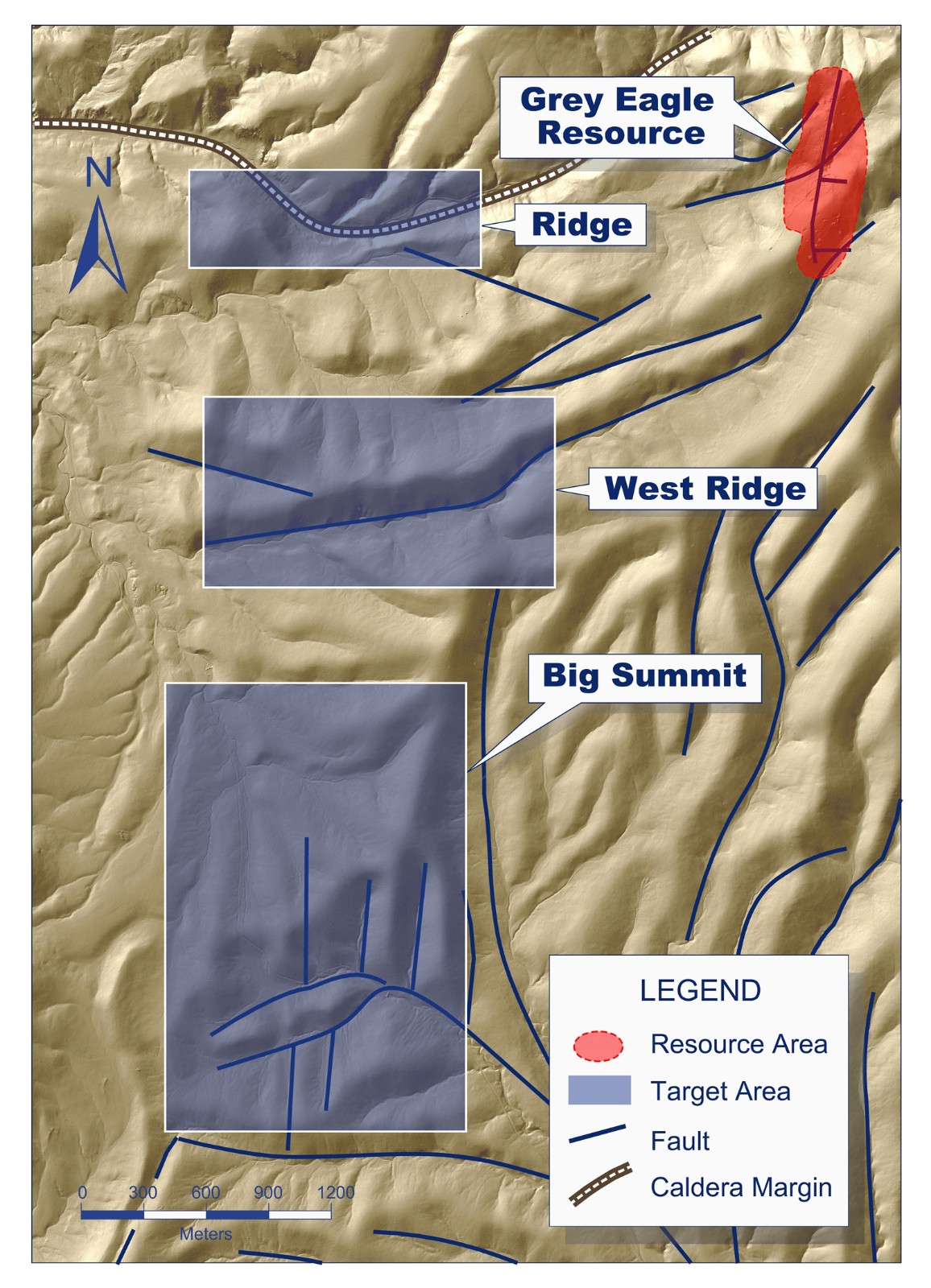 The Ridge target area is situated along Deer Lodge Canyon which follows the margin of the large Gold Springs caldera. The Grey Eagle resource is located along a splay of this same caldera margin. In addition, there are prominent northwest and northeast trending structures that intersect in the Ridge target area representing an obvious drill target.