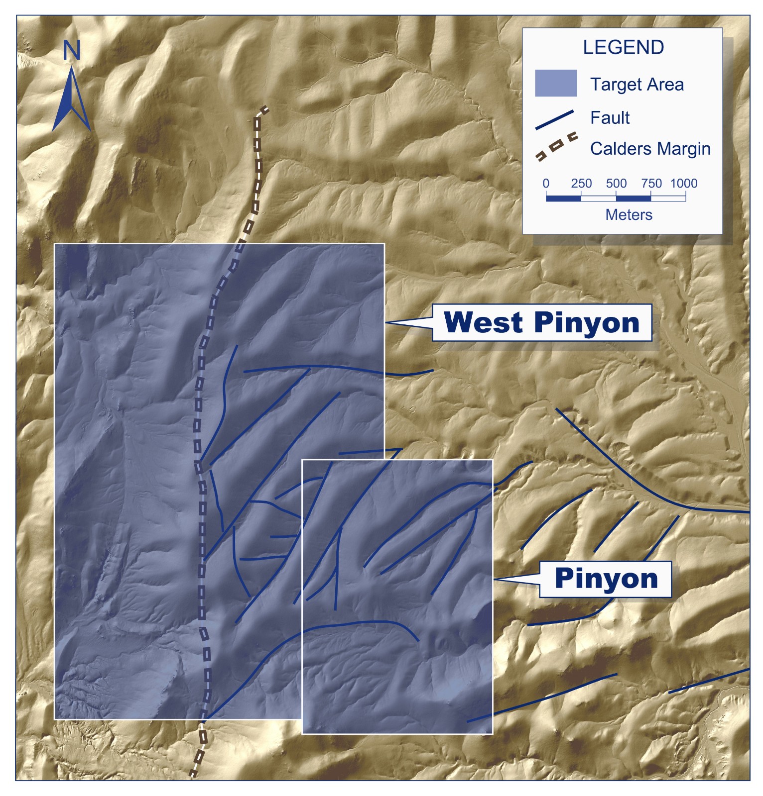 Structurally, the West Pinyon target is complex, with varying fault trends and limited surface exposure. The target hosts parallel sets of northeast trending ridges margined by fault zones of the same trend. Between bounding northeast trending fault zones, ridges are cut by a series of northwest, northeast and east-west trending faults that often host post-faulting rhyolite dikes and intermittent vein zones. Within fault blocks much of the host rock is hydrothermally brecciated, typical of collapse feature such as a caldera margin or breccia-pipe.