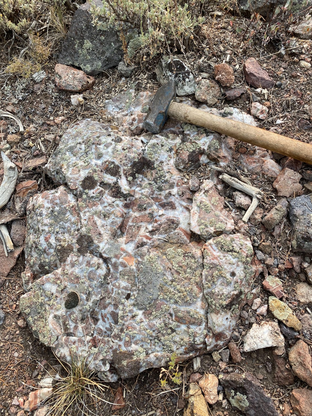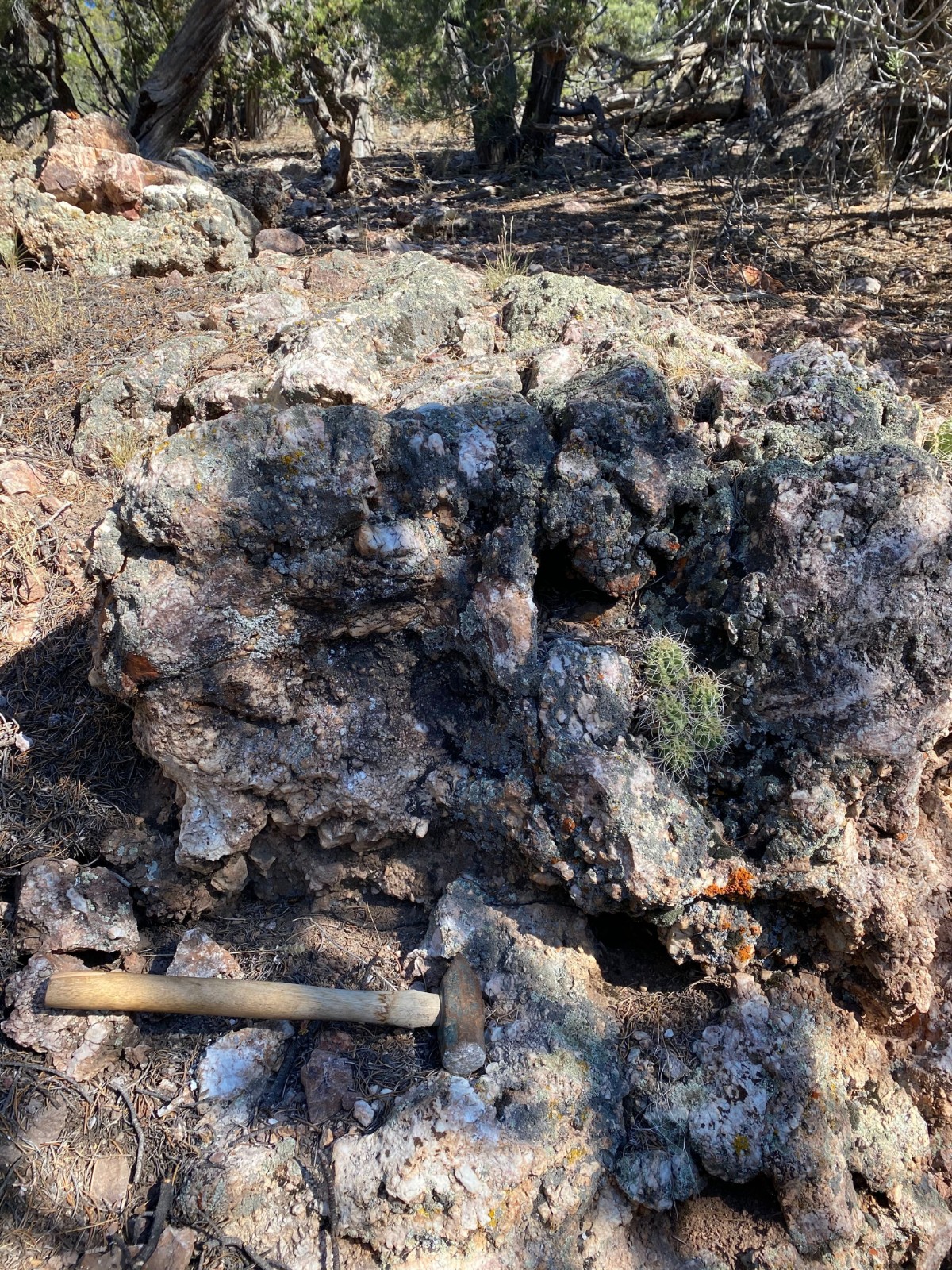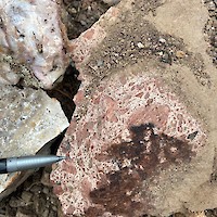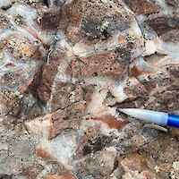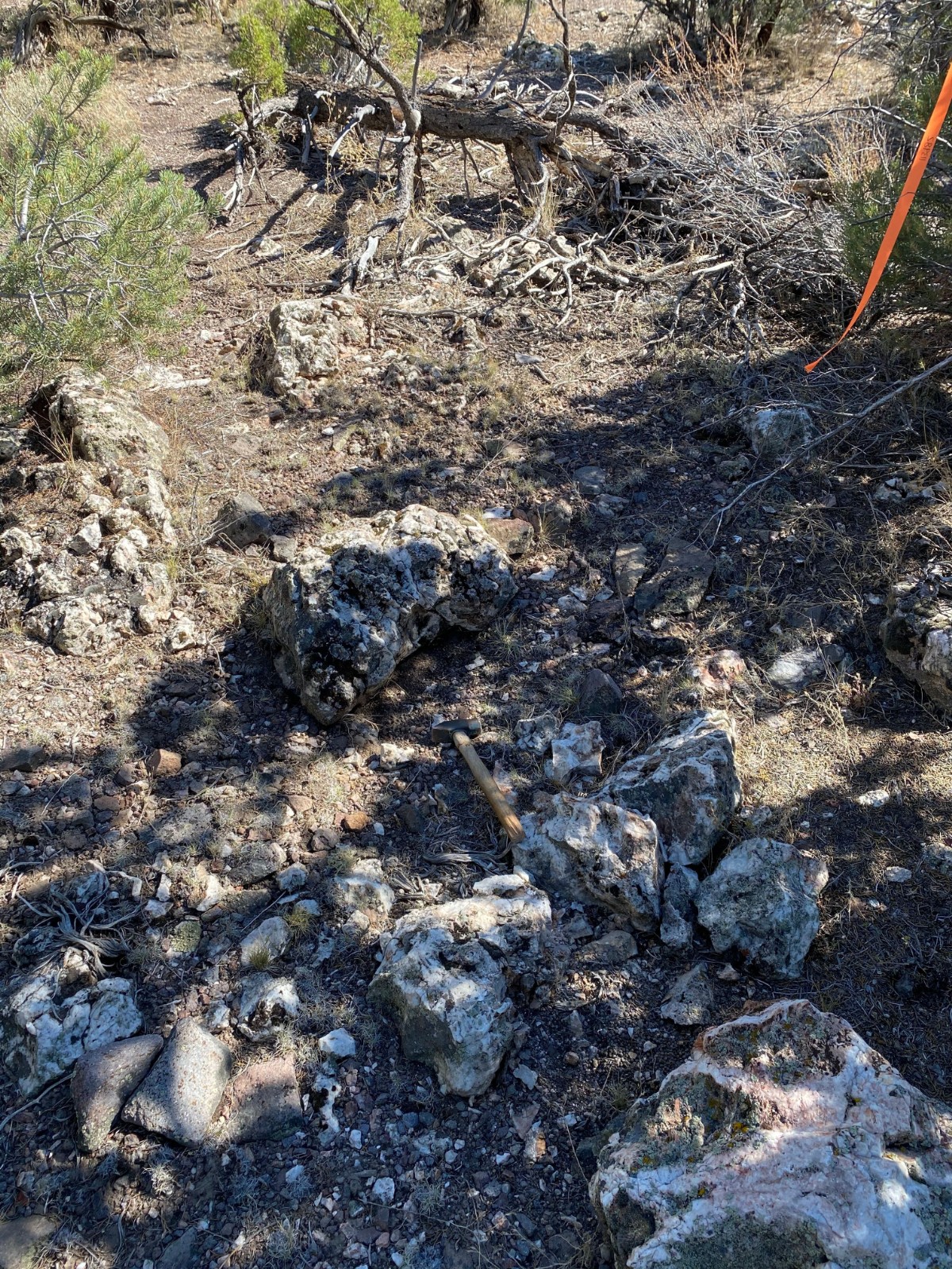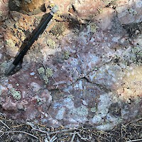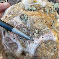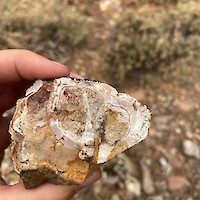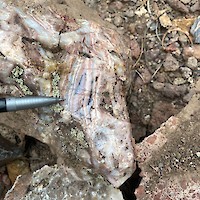 West Pinyon is largely covered with colluvium, however windows through the cover exposes discontinuous banded-bladed calcite-quartz vein zones and more expansive areas of hydrothermal brecciation. Mineralized float, dominantly in the form of hydrothermal breccia, is found mixed in with colluvium throughout much of the area suggesting that the post-mineral cover is thin. Hydrothermal breccia zones in outcrop cover an area of approximately 800m x 400m with scattered showings throughout the 1.1 x 2 kilometer target area.