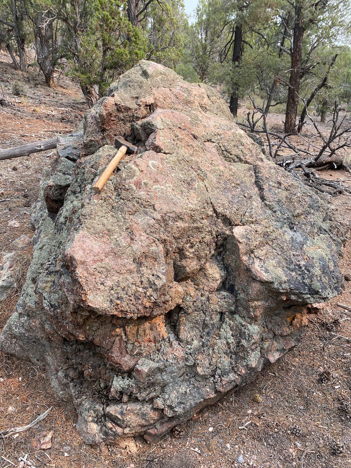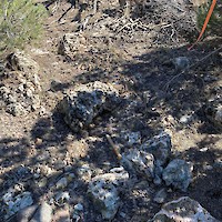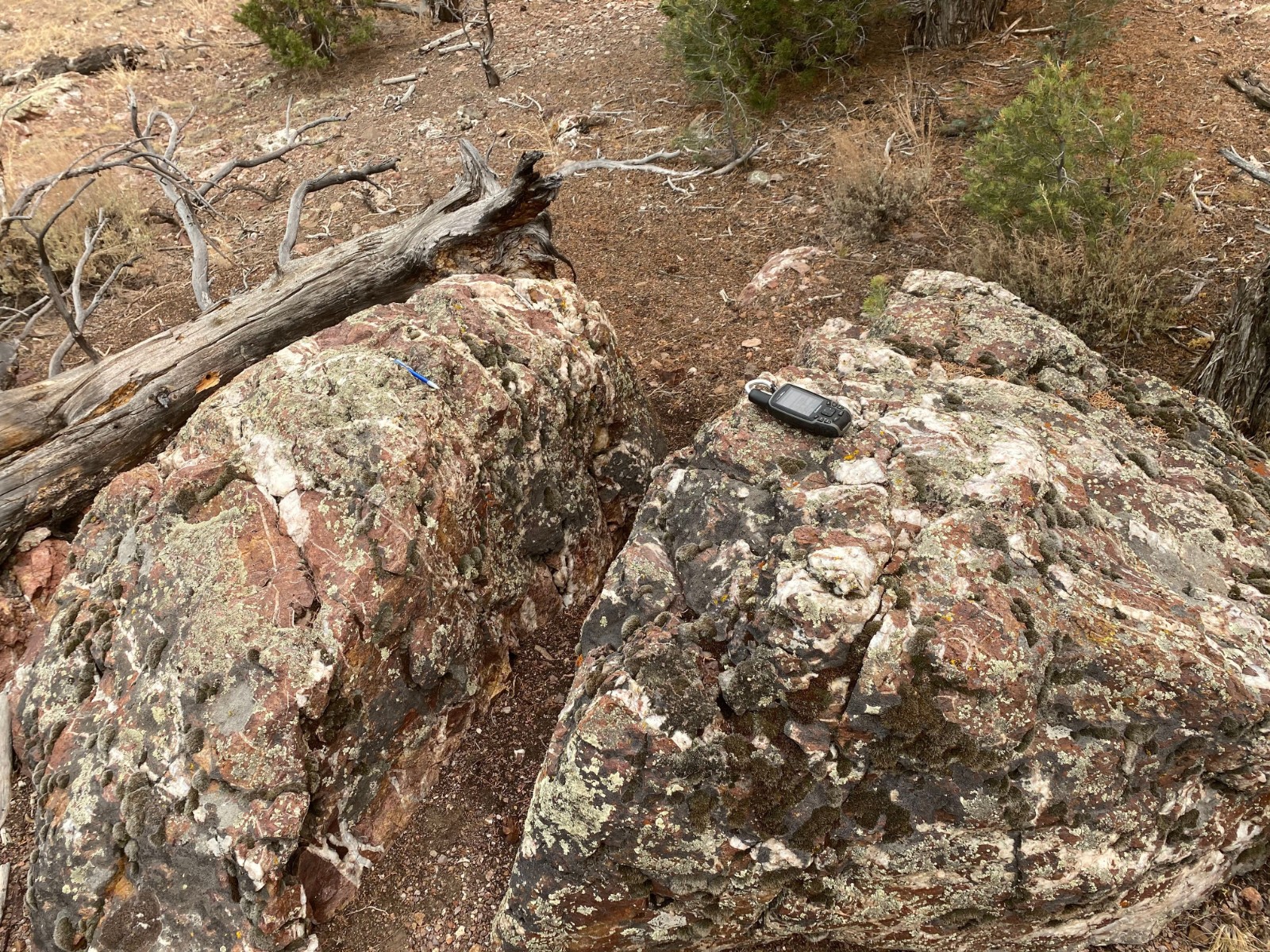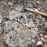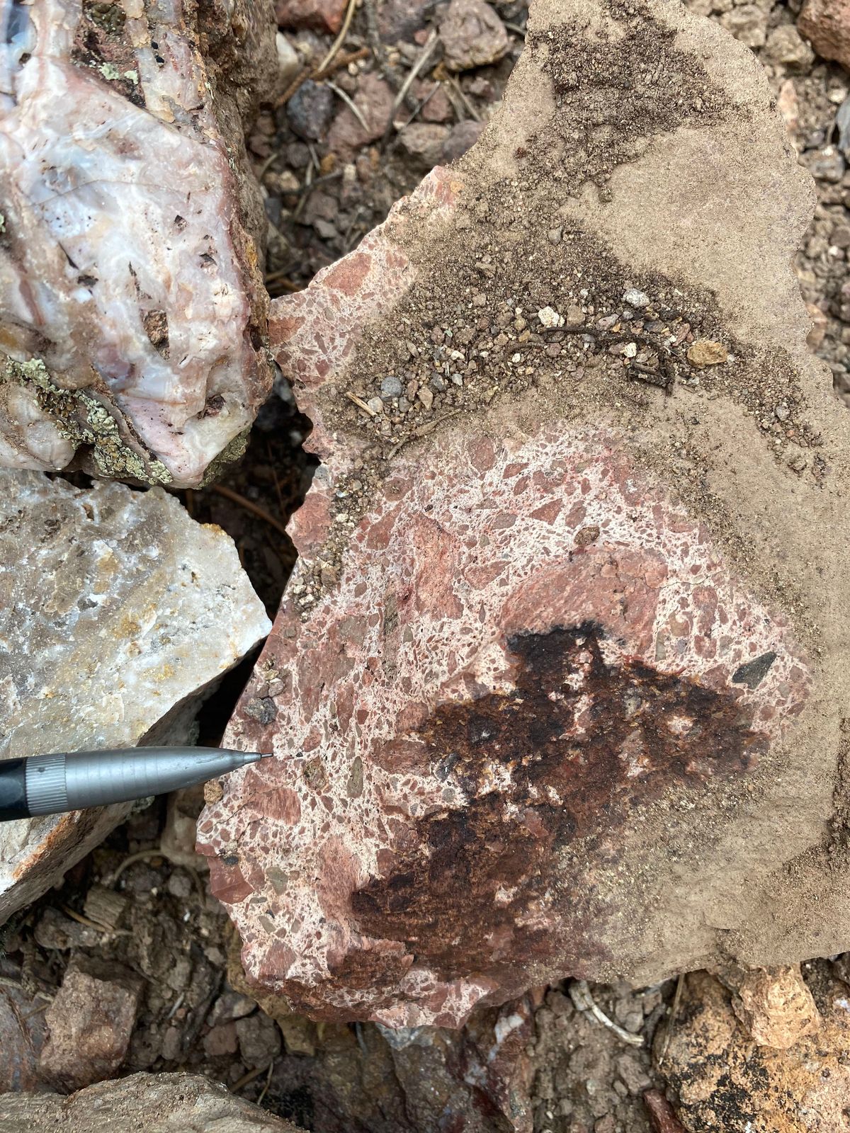 West Pinyon is largely covered with colluvium, however windows through the cover exposes discontinuous banded-bladed calcite-quartz vein zones and more expansive areas of hydrothermal brecciation. Mineralized float, dominantly in the form of hydrothermal breccia, is found mixed in with colluvium throughout much of the area suggesting that the post-mineral cover is thin. Hydrothermal breccia zones in outcrop cover an area of approximately 800m x 400m with scattered showings throughout the 1.1 x 2 kilometer target area.