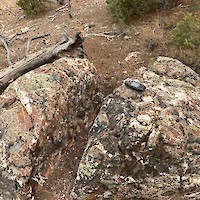 The West Pinyon target is situated along the western margin of the Gold Springs Caldera complex and displays structures related to the caldera collapse, similar to the setting at the Grey Eagle resource. Like the Pinyon target, West Pinyon is interpreted to be a high-level expression of a caldera-margin-hosted, epithermal, gold system. Mineralization is hosted in altered andesite flows. Younger rhyolite dikes cut across the target area with dominate northwest and east-west trends, some of which are altered and host stockwork quartz veining. The target covers 2.1 square kilometers that are largely covered with colluvium. However, where exposures are found, northeast, northwest and east-west trending calcite-quartz-vein zones display banded and bladed textures similar to those found at the existing resource areas on the project. The vein zones are often only traceable for 10’s of meters and appear at the margins of fault zones. These vein zones are interpreted to be fracture-fill, pod-like features resulting from faulting associated with a collapse feature.