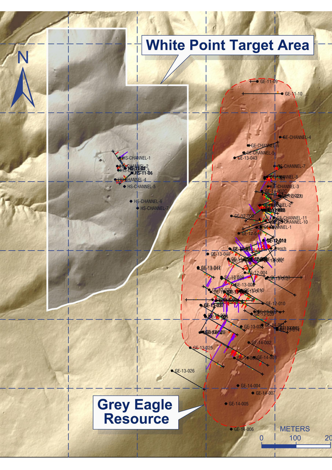 The vein zone at White Point is over 200 meters wide with the spacing between veins ranges from a few centimeters to several meters. This high density of veins creates a large tonnage bulk mineable target. The entire zone can be followed along strike for 400 meters with projected extensions covered by younger post-mineral rocks. These same younger rocks cover much of the Grey Eagle deposit which may be connected to White Point at depth.